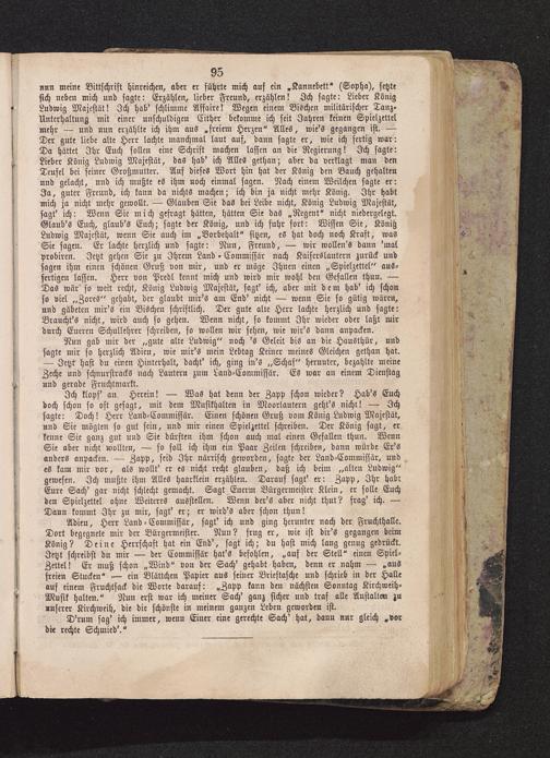 nun meine Bittschrift hinreichen, aber er führte mich auf ein „Kanncbctt" (Sopha), setztesich neben mich und sagte: Erzählen, lieber Freund, erzählen! Ich sagte: Lieber KönigLudwig Majestät! Ich hab' schlimme Affaire! Wegen einem Bischen militärischer Tanz-Unterhaltung mit einer unschuldigen Cither bekomme ich seit Jahren keinen Spielzcttelmehr — und nun erzählte ich ihm aus „freiem Herzen" Alles, wie's gegangen ist. —Der gute liebe alte Herr lachte manchmal laut auf, dann sagte er, wie ich fertig war:Da hättet Ihr Euch sollen eine Schrift machen lasten an die Regierung! Ich sagte:Lieber König Ludwig Majestät, das hab' ich Alles gethan; aber da verklagt man denTeufel bei seiner Großmutter. Auf dieses Wort hin hat der König den Bauch gehaltenund gelacht, und ich mußte es ihm noch einmal sagen. Nach einem Weilchen sagte er:Ja, guter Freund, ich kann da nichts machen; ich bin ja nicht mehr König. Ihr habtmich ja nicht mehr gewollt. — Glauben Sie das bei Leibe nicht, König Ludwig Majestät,sagt' ich: Wenn Sie mich gefragt hätten, hätten Sie das „Regent" nicht niedergelegt.Glaub's Euch, glaub's Euch; sagte der König, und ich fuhr fort: Misten Sie, KönigLudwig Majestät, wenn Sie auch im „Vorbehalt" sitzen, es hat doch noch Kraft, wasSie sagen. Er lachte herzlich und sagte: Nun, Freund, — wir wollcn's dann 'malprobiren. Jetzt gehen Sie zu Ihrem Land - Commiffär nach Kaiserslautern zurück undsagen ihm einen schönen Gruß von mir, und er möge Ihnen einen „Spielzcttel" aus-fertigen lasten. Herr von Predl kennt mich und wird mir wohl den Gefallen thun. —Das wär' so weit recht, König Ludwig Majestät, sagt' ich, aber mit dem hab' ich schonso viel „Zorcs" gehabt, der glaubt mir's am End' nicht — wenn Sie so gütig wären,und gäbcten mir's ein Bischen schriftlich. Der gute alte Herr lachte herzlich und sagte:Braucht's nicht, wird auch so gehen. Wenn nicht, so kommt Ihr wieder oder laßt mirdurch Eueren Schullehrcr schreiben, so wollen wir sehen, wie wir's dann anpacken.