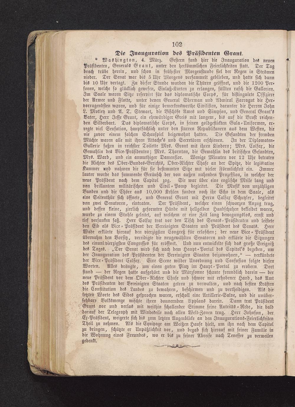 * Washington , 4. März. Gestern fand hier die Inauguration des neuenPräsidenten, Generals Graut, unter den herkömmlichen Feierlichkeiten statt. Der Tagbrach trübe herein, und schon in frühester Morgenstunde siel der Regen in Strömennieder. Der Senat war bis 5 Uhr Morgens versammelt geblieben, und hatte sich dannbis 10 Uhr vertagt. Zu dieser Stunde wurden die Thüren geöffnet, und die 1200 Per-sonen, welche so glücklich gewesen, Einlaß-Karten zu erlangen, füllten rasch die Gallerten.Im Saale waren Sitze reservirt für das diplomatische Corps, für distinguirte Offiziereder Armee und Flotte, unter denen General Sherman und Admiral Farragut die Her-vorragendste» waren, und für einige bemcrkcnswerthe Civilisten, darunter die Herren JohnL. Motley und A. T. Stewart, die Bischöfe Ames und Simpson, und General Grant'S Vater, Herr Jesse Grant, ein ehrwürdiger Greis mit langem, bis auf die Brust reichen-den Silbcrbart. Das diplomatische Corps, in seinen goldgestickten Gala-Uniformen, er-regte viel Sensation, hauptsächlich unter den starren Republikanern aus dem Westen, dienie zuvor einem solchen Schauspiel beigewohnt hatten. Die Gesandten der fremdenMächte waren alle mit ihren Attache's und Secretären erschienen. In der Diplomaten-Gallcrie saßen in reichster Toilette Mrs. Grant mit ihren Kindern; Mrs. Colfax, dieGemahlin des Vice-Präsidentcn; Mrs. Thornton, die Gemahlin des britischen Gesandten,MrS. Ward, und ein anmuthigcr Damenflor. Wenige Minuten vor 12 Uhr betratendie Richter des Obcr-Bundes-Gerichts, Ober-Richter Chase an der Spitze, die legislativeKammer und nahmen die für sie bestimmten Sitze mit vieler Förmlichkeit ein. Immerlauter wurde das summende Geräusch der von außen nahenden Prozession, in welcher derneue Präsident nach dem Capital zog. Sie war über eine englische Meile lang undvon brillantem militärischen und Civil-Pomp begleitet. Die Musik von unzähligenBanden und die Chöre aus 10,000 Kehlen fanden noch ihr Echo in dem Saale , alseine Seitenthür sich öffnete, und General Grant mit Herrn Calfax Schuyler, begleitetvon zwei Senatoren, eintraten. Der Präsident, welcher einen schwarzen Anzug trug,und dessen kleine, zierlich geformten Hände mit hellgelben Handschuhen bekleidet waren,wurde zu einem Stuhle geleitet, auf welchem er eine Zeit laug bewegungslos, ernst undtief versunken saß. Herr Colfax trat vor den Tisch des Senats-Präsidenten und leisteteden Eid als Vice - Präsident der Vereinigten Staaten und Präsident des Senats. HerrWade erklärte hierauf den vierzigsten Congreß für erloschen; der neue Vice - Präsidentübernahm den Vorsitz, vereidigte die ncugewühlten Senatoren und erklärte die Sitzungendes einund vierzigsten Congresses für eröffnet. Und nun entwickelte sich das große Ereignißdes Tages. „Der Senat wird sich nach dem Haupt-Portal des Capitol's begeben, umder Inauguration des Präsidenten der Vereinigten Staaten beizuwohnen," — verkündeteder Vice - Präsident Colfax. Eine Scene wilder Unordnung und Confusion folgte diesenWorten. Alles drängte, um einen guten Platz im Haupt-Portal zu erobern. Dortstand — der Regen hatte aufgehört und die Märzsonnc schaute freundlich darein — derneue Präsident vor dem Ober-Richter Chase und schwor mit erhobener Hand, das Amtdes Präsidenten der Vereinigten Staaten getreu zu verwalten, und nach besten Kräftendie Constitution des Landes zu bewahren, beschirmen und zu vertheidigen. Als dieletzten Worte des Eides gesprochen waren, erscholl eine Artilleric-Salve, und die unüber-sehbare Volksmenge mischte ihren donnernden Applaus darein. Dann trat PräsidentGrant vor und verlas mit weithin schallender Stimme seine Antritts - Rede, die balddarauf der Telegraph mit Windeseile nach allen Welt-Zonen trug. Herr Johnson, derEx-Präsident, weigerte sich bis zum letzten Augenblicke an den Jnaugurations-FeicrlichkeitenTheil zu nehmen. Als die Equipage am Weißen Hause hielt, um ihn nach dem Capitalzu bringen, schützte er Unpäßlichkeit vor, und begab sich hierauf mit seiner Familie indie Wohnung eines Freundes, wo er bis zu seiner Abreise nach Tenessce zu verweilengedenkt.