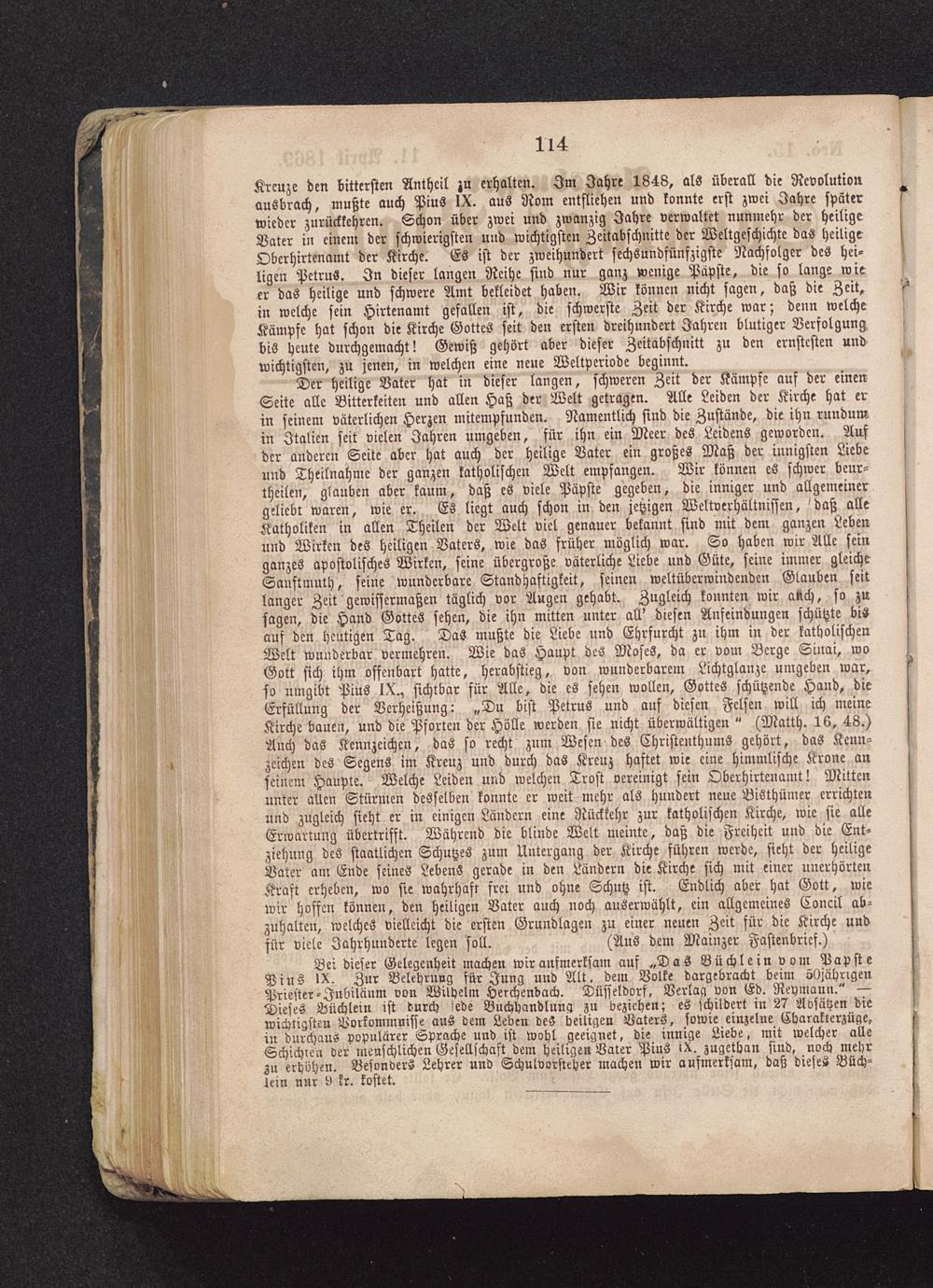 Kreuze den bittersten Antheil zu erhalten. Im Jahre 1848, als überall die Revolutionausbrach, mußte auch Pius !X. aus Nom entfliehen und konnte erst zwei Jahre späterwieder zurückkehren. Schon über zwei und zwanzig Jahre verwaltet nunmehr der heiligeVater in einem der schwierigsten und wichtigsten Zeitabschnitte der Weltgeschichte das heiligeObcrhirtenamt der Kirche. Es ist der zweihundert sechsundfünfzigste Nachfolger des hei-ligen Petrus . In dieser langen Reihe sind nur ganz wenige Papste, die so lange wieer das heilige und schwere Amt bekleidet haben. Wir können nicht sagen, daß die Zeit,in welche sein Hirtenamt gefallen ist, die schwerste Zeit der Kirche war; denn welcheKämpfe hat schon die Kirche Gottes seit den ersten dreihundert Jahren blutiger Verfolgungbis heute durchgemacht! Gewiß gehört aber dieser Zeitabschnitt zu den ernstesten undwichtigsten, zu jenen, in welchen eine neue Weltpcrivde beginnt.