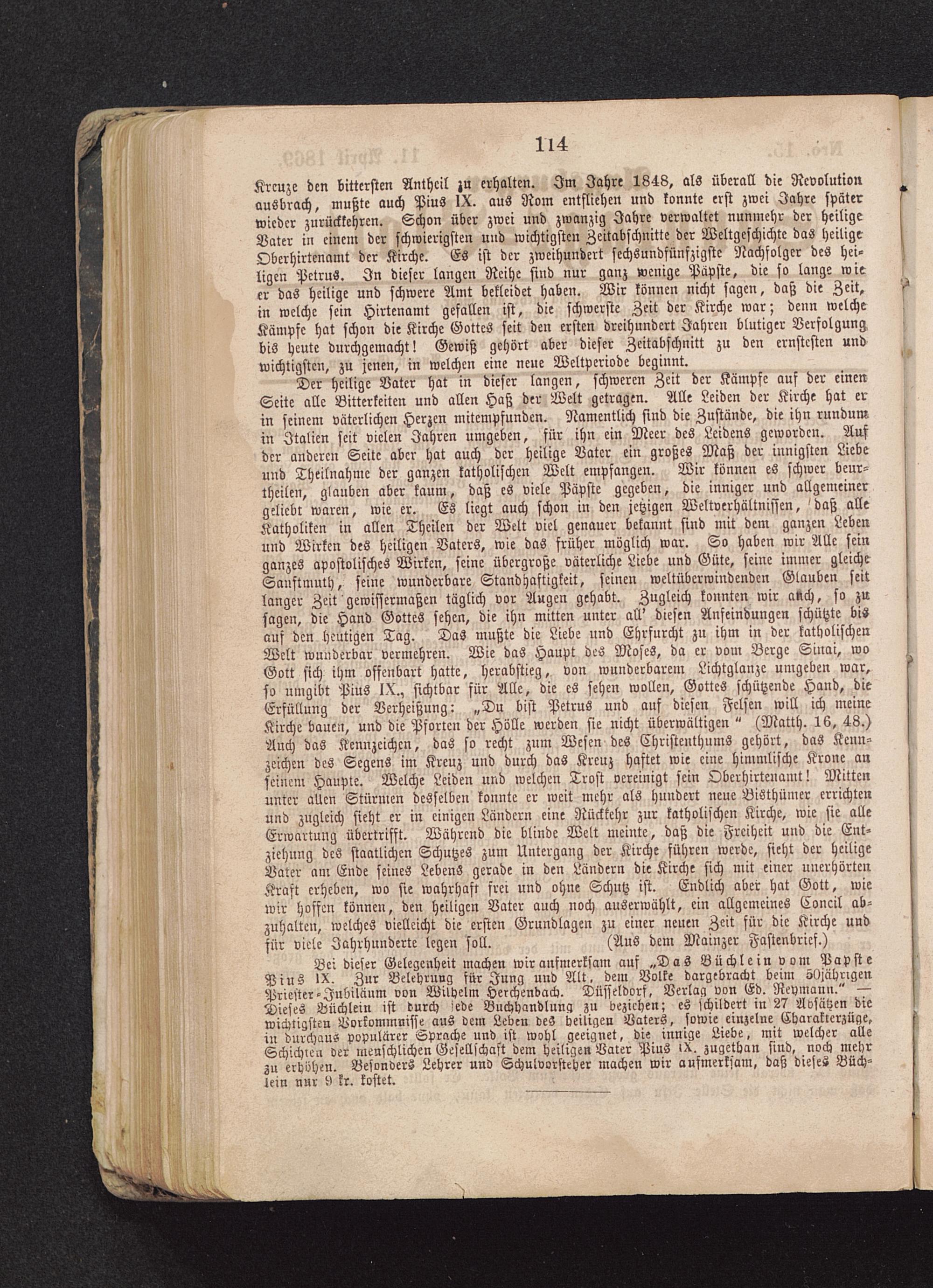 Der heilige Vater hat in dieser langen, schweren Zeit der Kämpfe auf der einenSeite alle Bitterkeiten und allen Haß der Welt getragen. Alle Leiden der Kirche hat erin seinem väterlichen Herzen mitempfunden. Namentlich sind die Zustände, die ihn rundumin Italien seit vielen Jahren umgeben, für ihn ein Meer des Leidens geworden. Aufder anderen Seite aber hat auch der heilige Vater ein großes Maß der innigsten Liebeund Theilnahme der ganzen katholischen Welt empfangen. Wir können es schwer beur-theilen, glauben aber kaum, daß es viele Päpste gegeben, die inniger und allgemeiner