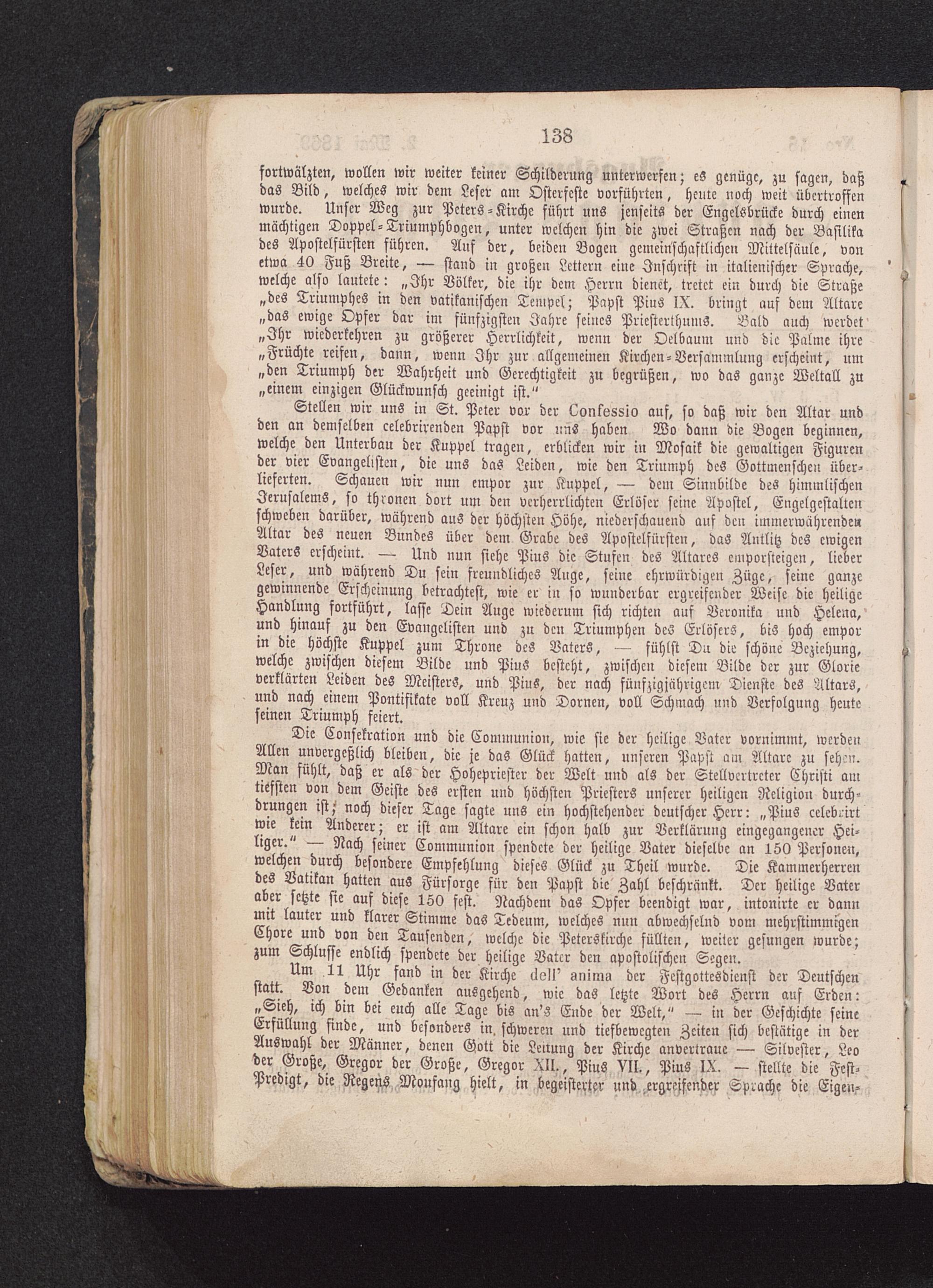 fortwälzten, wollen wir weiter keiner Schilderung unterwerfen; eS genüge, zu sagen, daßdas Bild, welches wir dem Leser am Osterfeste vorführten, heute noch weit übertroffenwurde. Unser Weg zur Peters-Kirche führt uns jenseits der Engelsbrücke durch einenmächtigen Doppel-Triumphbogen, unter welchen hin die zwei Straßen nach der Basilikades Apostelfürstcn führen. Auf der, beiden Bogen gemeinschaftlichen Mittelsäule, vonetwa 40 Fuß Breite, — stand in großen Lettern eine Inschrift in italienischer Sprache,welche also lautete: „Ihr Völker, die ihr dem Herrn dienet, tretet ein durch die Straße„des Triumphes in den vatikanischen Tempel; Papst Pius IX. bringt auf dem Altare„das ewige Opfer dar im fünfzigsten Jahre seines PriesterthnmS. Bald auch werdet„Ihr wiederkehren zu größerer Herrlichkeit, wenn der Oelbaum und die Palme ihre„Früchte reifen, dann, wenn Ihr zur allgemeinen Kirchen-Versammlung erscheint, um„den Triumph der Wahrheit und Gerechtigkeit zu begrüßen, wo das ganze Weltall zu„einem einzigen Glückwunsch geeinigt ist."