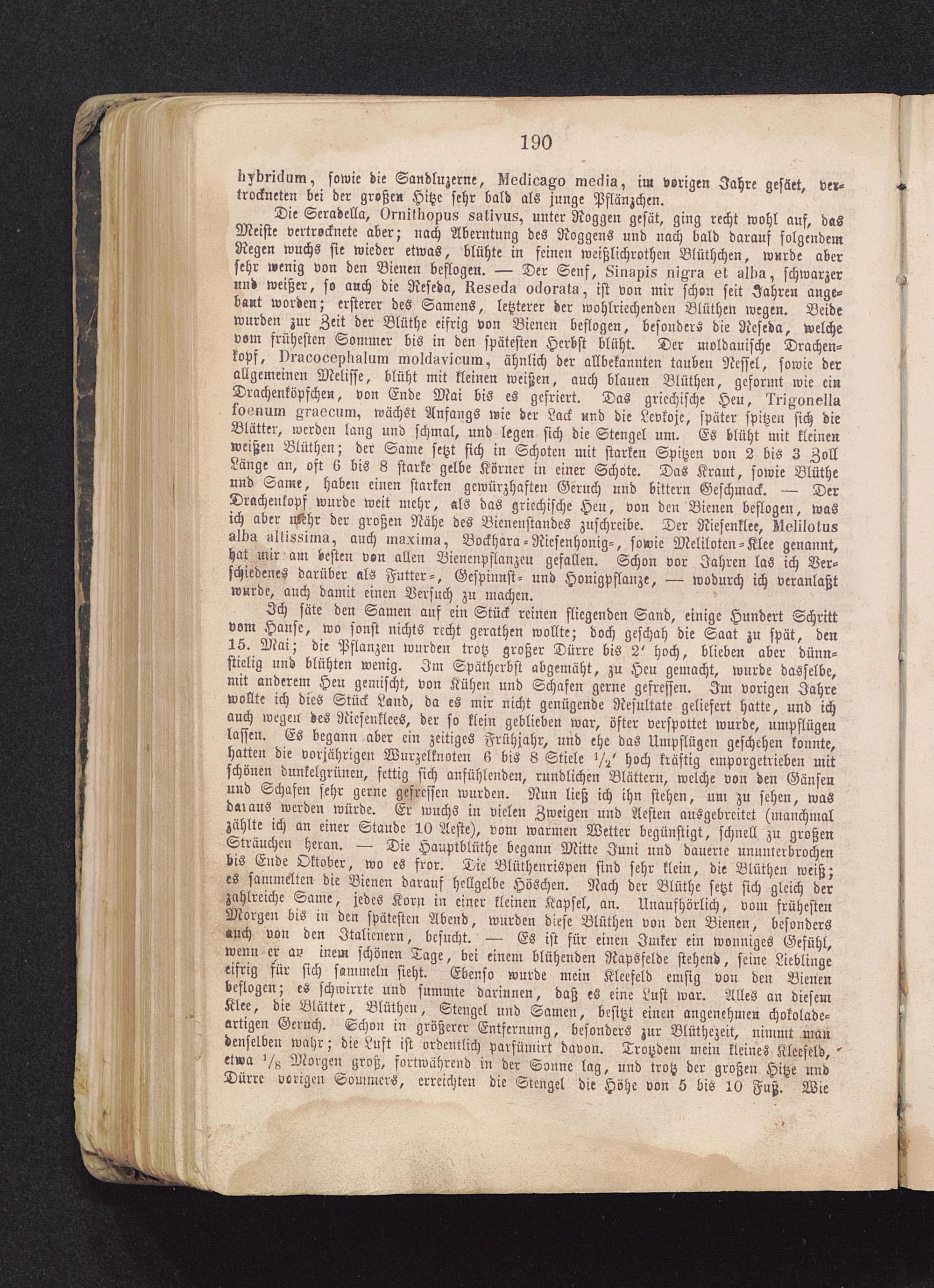 Die Scradella, Oniitllopus sstivus, unter Roggen gesät, ging recht wohl auf, dasMeiste vertrocknete aber; nach Aberntung des Roggens und nach bald darauf folgendemRegen wuchs sie wieder etwas, blühte in feinen weißlichrothen Blüthchen, wurde abersehr wenig von den Bienen beflogen. — Der Senf, K'mapis niFru ot sllm, schwarzerund weißer, so auch die Reseda, Uasocka ockor-ltg, ist von mir schon seit Jahren ange-baut worden; ersterer des Samens, letzterer der wohlriechenden Blüthen wegen. Beidewurden zur Zeit der Blüthe eifrig von Bienen beflogen, besonders die Reseda, welchevorn frühesten Sommer bis in den spätesten Herbst blüht. Der moldauische Drachen-kopf, Dinoooopliglum molflaviaum, ähnlich der allbekannten tauben Nessel, sowie derallgemeinen Melisse, blüht mit kleinen weißen, auch blauen Blüthen, geformt wie einDrachenköpfchen, von Ende Mai bis es gefriert. Das griechische Heu, TiißoneUskoanuiri Arnoeum, wächst Anfangs wie der Lack und die Levkoje, später spitzen sich dieBlätter, werden lang und schmal, und legen sich die Stengel um. Es blüht mit kleinenweißen Blüthen; der Same setzt sich in Schoten mit starken Spitzen von 2 bis 3 ZollLänge an, oft 6 bis 8 starke gelbe Körner in einer Schote. Das Kraut, sowie Blütheund Same, haben einen starken gcwürzhaften Geruch und bittern Geschmack. — DerDrachenkopf wurde weit mehr, als das griechische Heu, von den Bienen beflogen, wasich aber rOhr der großen Nähe des Bienenstandes zuschreibe. Der Niesenklcc, i1olilotu8sitzn nllissung, auch iiinxima, Bockhara-Riesenhonig-, sowie Melilotcn-Klee genannt,hat mir am besten von allen Bicncnpstanzen gefallen. Schon vor Jahren las ich Ver-schiedenes darüber als Futter-, Gespinnst- und Honigpflanzc, — wodurch ich veranlaßtwurde, auch damit einen Versuch zu machen.