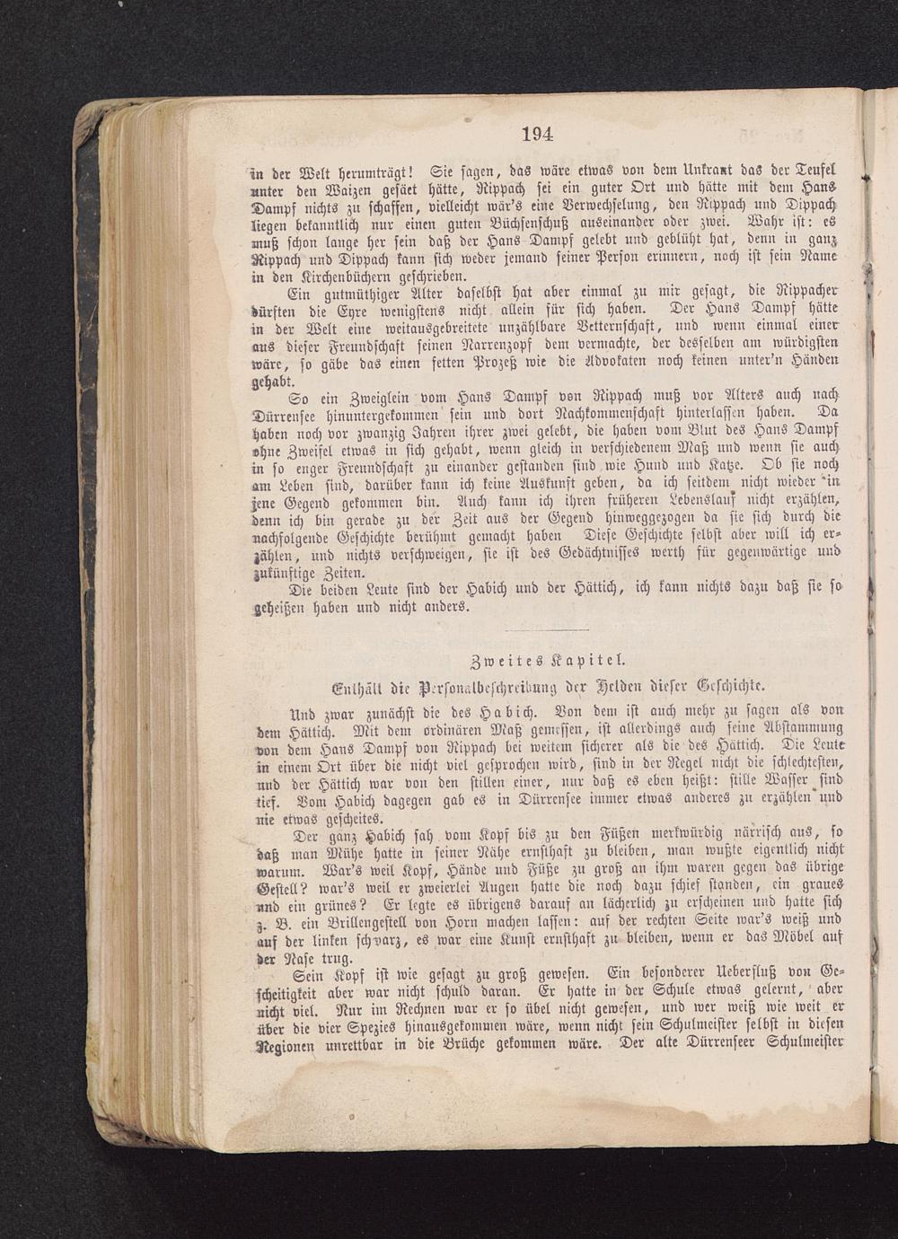 Der ganz Habich sah vom Kopf bis zu den Füßen merkwürdig närrisch aus, sobaß man Mühe hatte in seiner Nahe ernsthaft zu bleiben, man wußte eigentlich nichtwarum. War's weil Kopf, Hände und Füße zu groß an ihm waren gegen das übrigeGestell? war's weil er zweierlei Augen hatte die noch dazn schief standen, ein grauesund ein grünes? Er legte es übrigens darauf an lächerlich zu erscheinen und hatte sichz. B. ein Brillengestell von Horn machen lassen: auf der rechten Seite war's weiß undauf der linken schwarz, es war eine Kunst ernsthaft zu bleiben, wenn er das Möbel ausder Nase trug.
