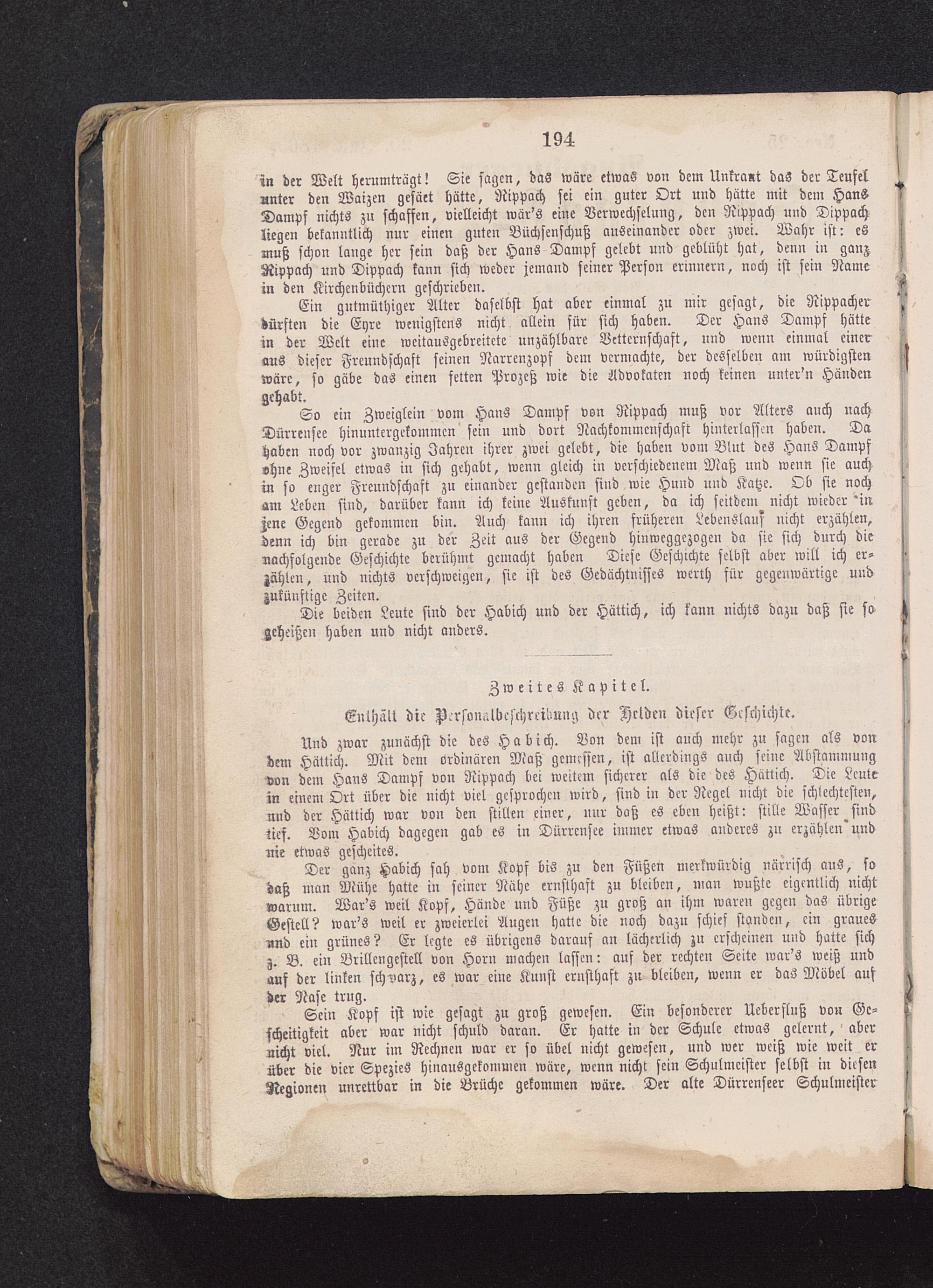 in der Welt herumträgt! Sie sagen, das wäre etwas von dem Unkraut das der Teufelunter den Walzen gesäet hätte, Rippach sei ein guter Ort und hätte mit dem HansDampf nichts zu schaffen, vielleicht wär's eine Verwechselung, den Rippach und Dippachliegen bekanntlich nur einen guten Büchsenschuß auseinander oder zwei. Wahr ist: esmuß schon lange her sein daß der Hans Dampf gelebt und geblüht hat, denn in ganzRippach und Dippach kann sich weder jemand seiner Person erinnern, noch ist sein Namein den Kirchenbüchern geschrieben.