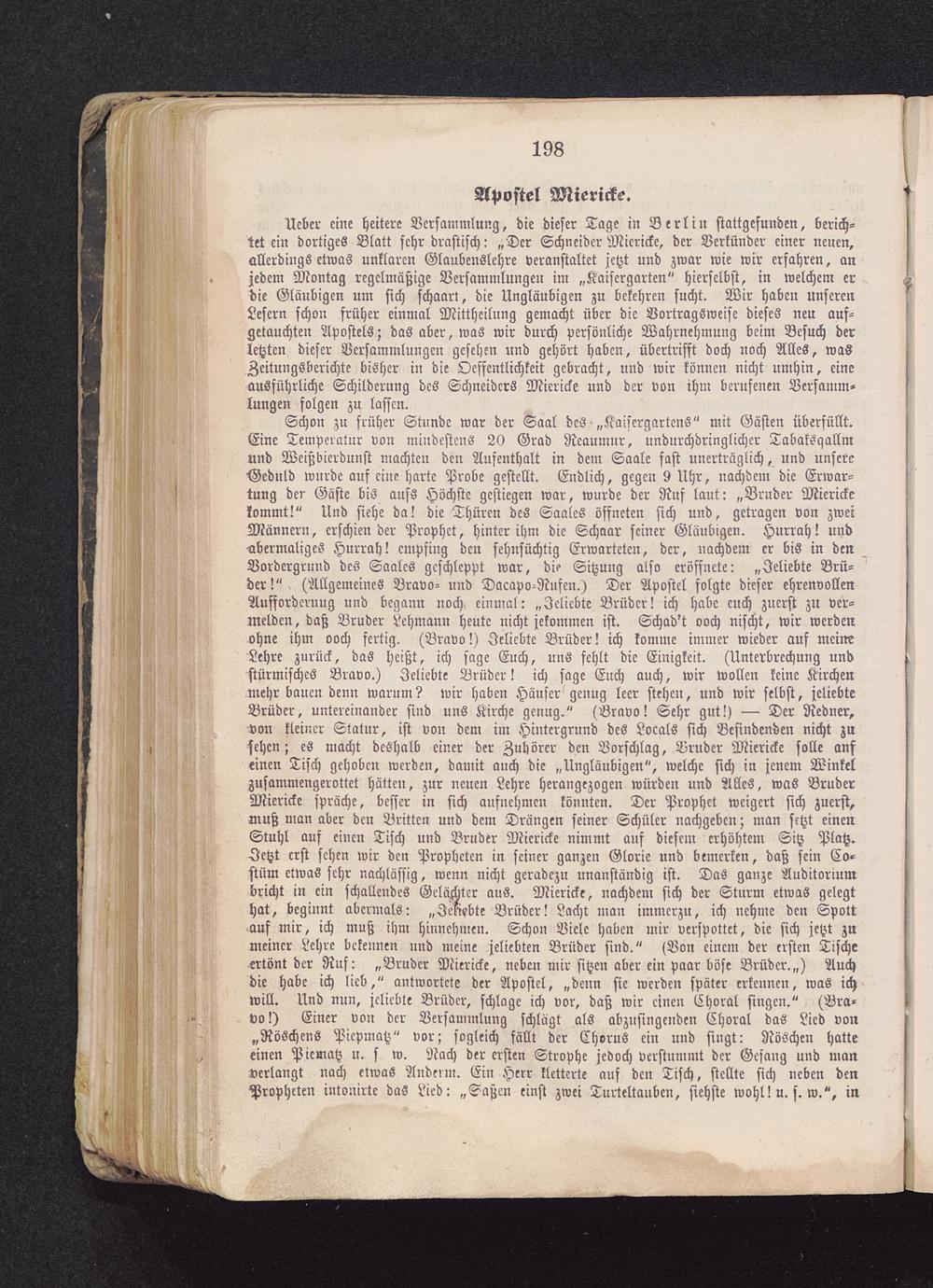 Schon zu früher Stunde war der Saal des „Kaisergartcns" mit Gästen überfüllt.Eine Temperatur von mindestens 20 Grad Rcaumur, undurchdringlicher Tabaksgallmund Weißbicrdunst machten den Aufenthalt in dem Saale fast unerträglich, und unsereGeduld wurde auf eine harte Probe gestellt. Endlich, gegen 9 Uhr, nachdem die Erwar-tung der Gaste bis anss Höchste gestiegen war, wurde der Ruf laut: „Bruder Mierickekommt!" Und siehe da! die Thüren des Saales öffneten sich und, getragen von zweiMännern, erschien der Prophet, hinter ihm die Schaar seiner Gläubigen. Hurrah! undabermaliges Hurrah! empfing den sehnsüchtig Erwarteten, der, nachdem er bis in denVordergrund des Saales geschleppt war, die Sitzung also eröffnete: „Jeliebte Brü-der!" (Allgemeines Bravo- und Dacapo-Nufen.) Der Apostel folgte dieser ehrenvollenAufforderung und begann noch einmal: „Jeliebte Brüdcr! ich habe euch zuerst zu ver-melden, daß Bruder Lehmann heute nicht jekommen ist. Schad't ooch nischt, wir werdenohne ihm ooch fertig. (Bravo !) Jeliebte Brüdcr! ich komme immer wieder auf meineLehre zurück, das heißt, ich sage Euch, uns fehlt die Einigkeit. (Unterbrechung undstürmisches Bravo.) Jeliebte Brüder! ich sage Euch auch, wir wollen keine Kirchenmehr bauen denn warum? wir haben Häuser genug leer stehen, und wir selbst, jeliebteBrüdcr, untereinander sind uns Kirche genug." (Bravo ! Sehr gut!) — Der Redner,von kleiner Statur, ist von dem im Hintergrund des Locals sich Befindenden nicht zusehen; es macht deshalb einer der Zuhörer den Vorschlag, Bruder Miericke solle auf«inen Tisch gehoben werden, damit auch die „Ungläubigen", welche sich in jenem Winkelzusammengerottet hätten, zur neuen Lehre herangezogen würden und Alles, was BruderMiericke spräche, besser in sich aufnehmen könnten. Der Prophet weigert sich zuerst,muß man aber den Brüten und dem Drängen seiner Schüler nachgeben; man setzt einenStuhl auf einen Tisch und Bruder Miericke nimmt auf diesem erhöhtem Sitz Platz.Jetzt erst sehen wir den Propheten in seiner ganzen Glorie und bemerken, daß sein Co-stüm etwas sehr nachlässig, wenn nicht geradezu unanständig ist. Das ganze Auditoriumbricht in ein schallendes Gelächter aus. Miericke, nachdem sich der Sturm etwas gelegthat, beginnt abermals: „Jeliebte Brüdcr! Lacht man immerzu, ich nehme den Spottauf mir, ich muß ihm hinnehmen. Schon Viele haben mir verspottet, die sich jetzt zumeiner Lehre bekennen und meine jeliebten Brüder sind." (Bon einem der ersten Tischeertönt der Ruf: „Bruder Miericke, neben mir sitzen aber ein paar böse Brüdcr.,,) Auchdie habe ich lieb," antwortete der Apostel, „denn sie werden später erkennen, was ichwill. Und nun, jeliebte Brüder, schlage ich vor, daß wir einen Ehoral singen." (Bra-vo !) Einer von der Versammlung schlügt als abzusingenden Ehoral das Lied von„Röschens Piepmatz" vor; sogleich fällt der Chorus ein und singt: Röschen hatteeinen Piematz u. s w. Nach der ersten Strophe jedoch verstummt der Gesang und manverlangt nach etwas Anbei in. Ein Herr kletterte auf den Tisch, stellte sich neben denPropheten intonirte das Lied: „Saßen einst zwei Turteltauben, siehste wohl! u. s. w.", in