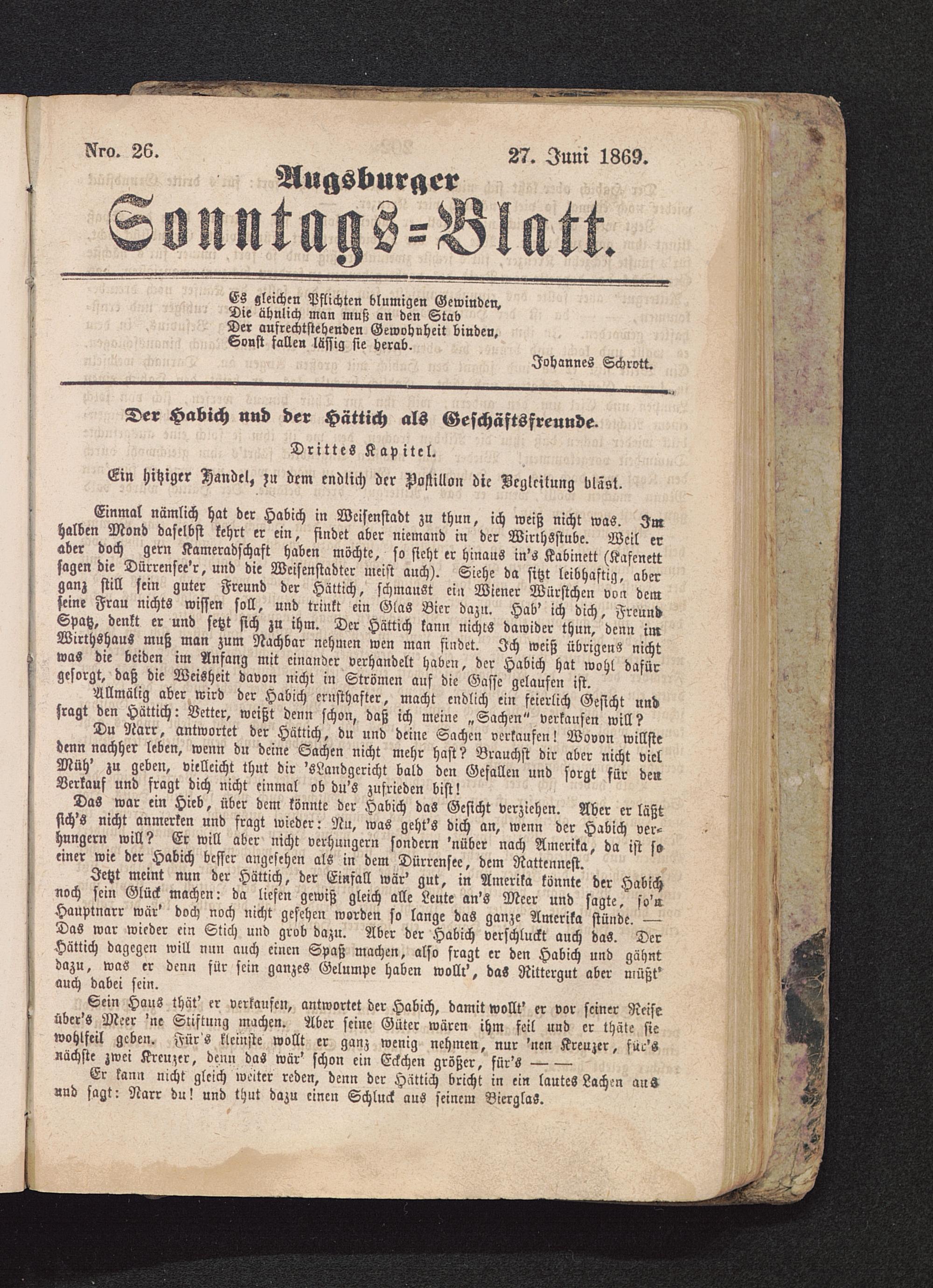 Du Narr, antwortet der Hättich, du und deine Sachen verkaufen! Wovon willstedenn nachher leben, wenn du deine Sachen nicht mehr hast? Brauchst dir aber nicht vielMüh' zu geben, vielleicht thut dir 'sLandgcricht bald den Gefallen und sorgt für denVerkauf und fragt dich nicht einmal ob du's zufrieden bist!