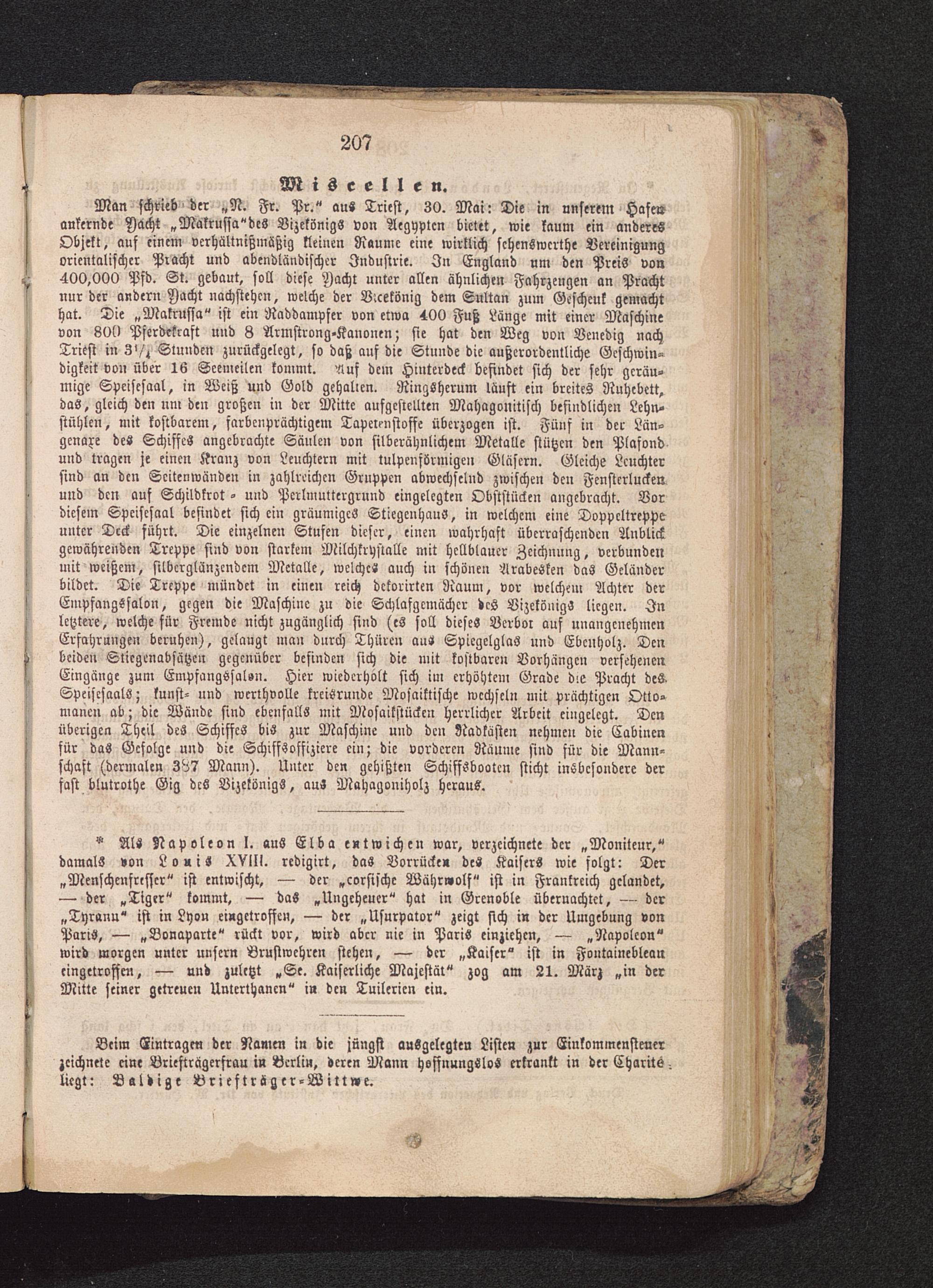 SpeisesaalS; kunst- und wcrthvolle kreisrunde Mosaiktische wechseln mit prächtigen Otto-manen ab; die Wände sind ebenfalls mit Mosaikstückcn herrlicher Arbeit eingelegt. Denüberigcn Theil deS Schiffes bis zur Maschine und den Radkasten nehmen die Cabiucnj für das Gefolge und die Schiffsoffiziere ein; die vorderen Räume sind für die Mann-schaft (dermalen 387 Mann). Unter den gehißten Schiffsbootcn sticht insbesondere derfast blutrothe Gig deS VizckönigS, aus Mahagoniholz heraus.