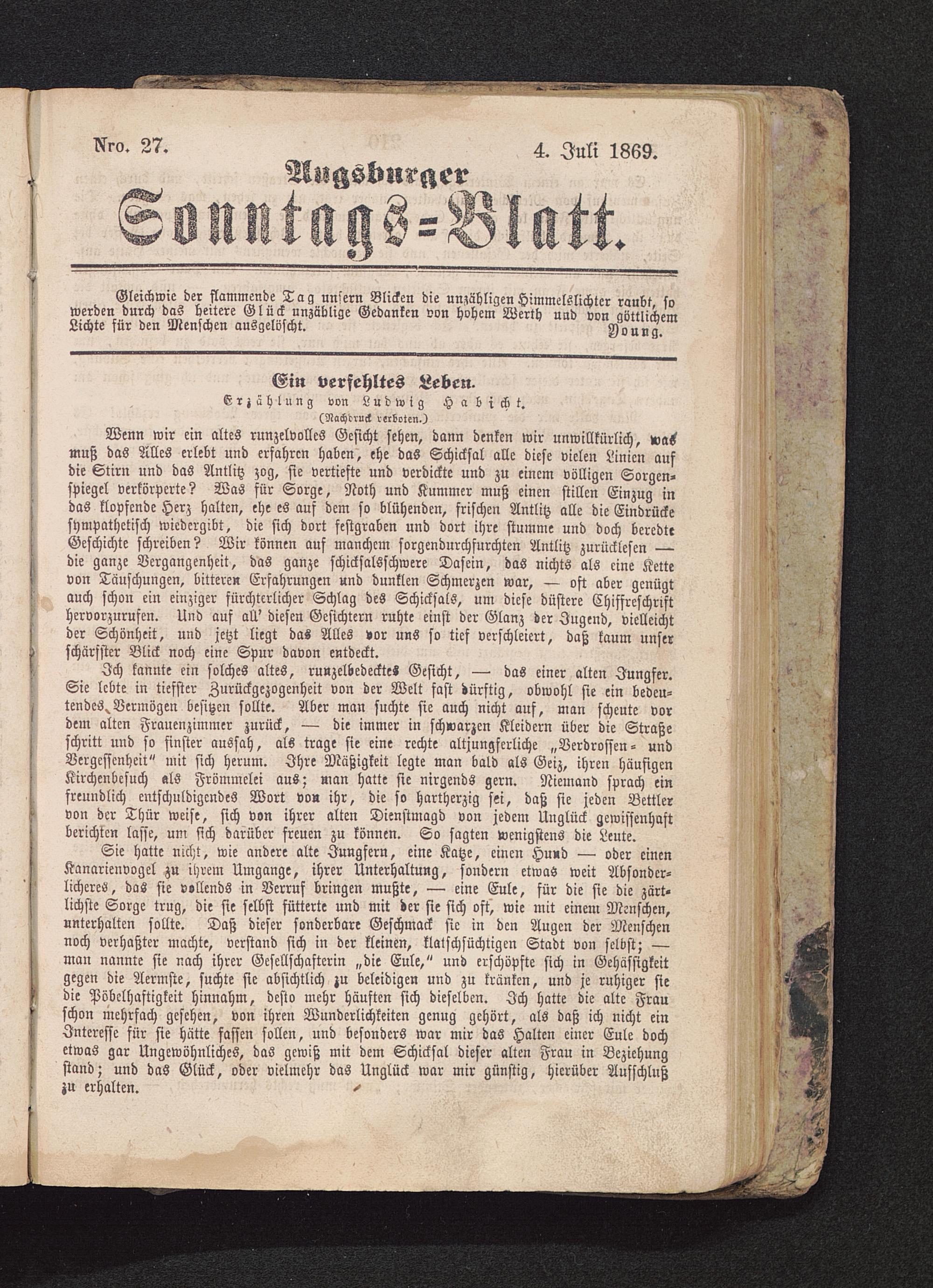 Sie hatte nicht, wie andere alte Jungfern, eine Katze, einen Huvd — oder einenKanarienvogel zu ihrem Umgänge, ihrer Unterhaltung, sondern etwas weit Absonder-licheres, das sie vollends in Verruf bringen mußte, — eine Eule, für die sie die zärt-lichste Sorge trug, die sie selbst fütterte und mit der sie sich oft, wie mit einem Menschen,unterhalten sollte. Daß dieser sonderbare Geschmack sie in den Augen der Menschennoch verhaßter machte, verstand sich in der kleinen, klatschsüchtigen Stadt von selbst; —man nannte sie nach ihrer Gesellschafterin „die Eule," und erschöpfte sich in Gehässigkeitgegen die Aermste, suchte sie absichtlich zu beleidigen und zu kränken, und je ruhiger siedie Pöbclhaftigkeit hinnahm, desto mehr häuften sich dieselben. Ich hatte die alte Frauschon mehrfach gesehen, von ihren Wunderlichkeiten genug gehört, als daß ich nicht einInteresse für sie hätte fassen sollen, und besonders war mir das Halten einer Eule dochetwas gar Ungewöhnliches, das gewiß mit dem Schicksal dieser alten Frau in Beziehungstand; und das Glück, oder vielmehr das Unglück war mir günstig, hierüber Ausschlußzu erhalten. ^