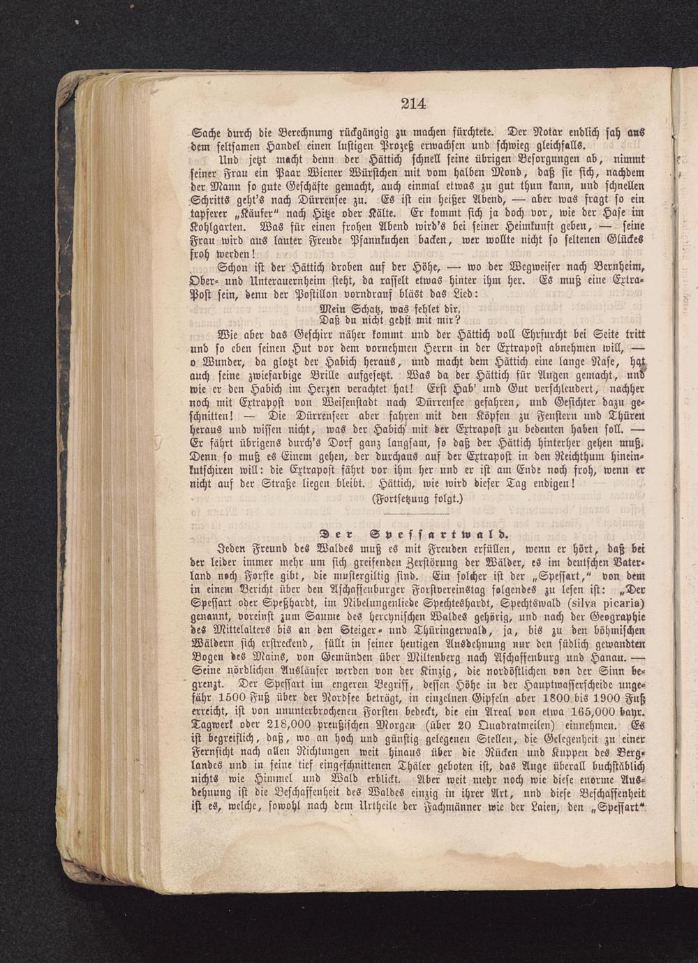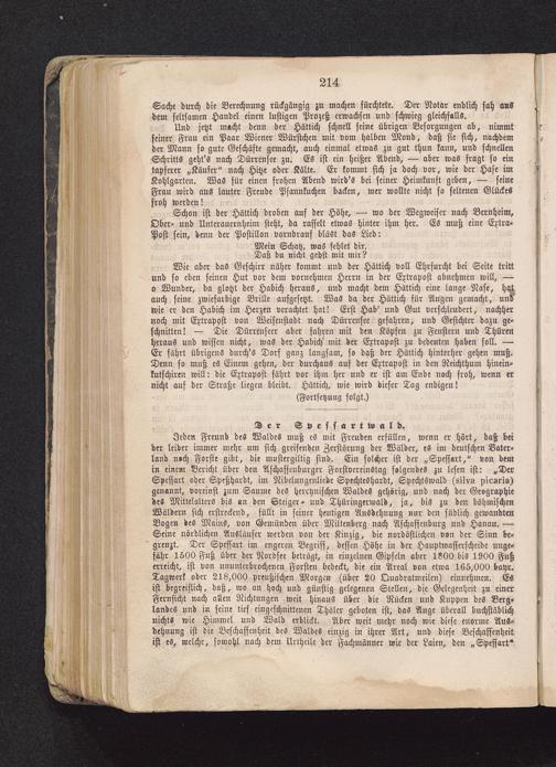 Jeden Freund des Waldes muß es mit Freuden erfüllen, wenn er hört, daß beider leider immer mehr um sich greifenden Zerstörung der Wälder, es im deutschen Vater-land noch Forste gibt, die mustergiltig sind. Ein solcher ist der „Speffart," von demin einem Bericht über den Aschaffenburgcr Forstvereinstag folgendes zu lesen ist: „DerSpeffart oder Speßhardt, im Nibelungenliede Spechteshardt, Spcchtswald (silvn picsria)genannt, voreinst zum Saume des hercynischen Waldes gehörig, und nach der Geographiedes Mittelalters bis an den Steiger- und Thüringerwald , ja, bis zu den böhmischenWäldern sich erstreckend, füllt in seiner heutigen Ausdehnung nur den südlich gewandtenBogen des MainS, von Gemeinden über Millenberg nach Aschaffenburg und Hanau . —Seine nördlichen Ausläufer werden von der Einzig, die nordöstlichen von der Sinn be-grenzt. Der Speffart im engeren Begriff, dessen Höhe in der Hauptwafferscheide unge-fähr 1500 Fuß über der Nordsee beträgt, in einzelnen Gipfeln aber 1800 bis 1900 Fußerreicht, ist von ununterbrochenen Forsten bedeckt, die ein Areal von etwa 165,000 bahr.Tagwerk oder 218,000 Preußischen Morgen (über 20 Quadratmcilcn) einnehmen. Esist begreiflich, daß, wo an hoch und günstig gelegenen Stellen, die Gelegenheit zu einerFernsicht nach allen Züchtungen weit hinaus über die Rücken und Kuppen des Berg-landes und in seine tief eingefchnitteuen Thäler geboten ist, das Auge überall buchstäblichnichts wie Himmel und Wald erblickt. Aber weit mehr noch wie diese enorme Aus-dehnung ist die Beschaffenheit des WaldcS einzig in ihrer Art, und diese Beschaffenheitist es, welche, sowohl nach dem Urtheile der Fachmänner wie der Laien, den „Speffart"