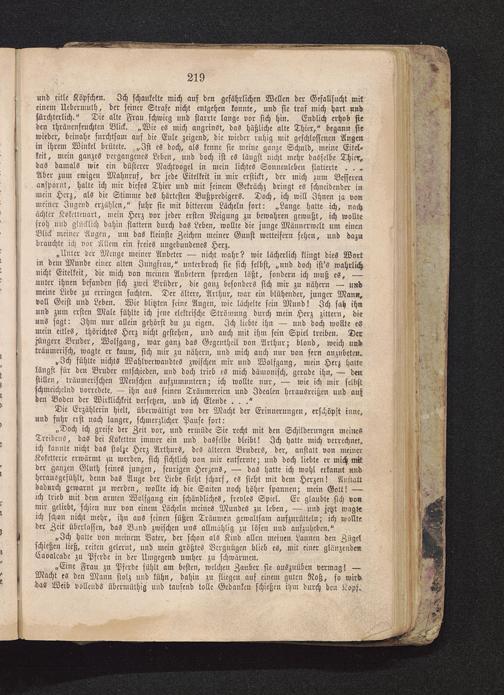 „Doch ich greife der Zeit vor, und ermüde Sie recht mit den Schilderungen meinesTreibens, das bei Koketten immer ein und dasselbe bleibt! Ich hatte mich verrechne!,ich kannte nicht das stolze Herz Arthurs, des älteren Bruders, der, anstatt von meinerKoketterie erwärmt zu werden, sich sichtlich von mir entfernte; und doch liebte er mich mLder ganzen Gluth seines jungen, feurigen Herzens, — das hatte ich wohl erkannt undherausgefühlt, denn das Auge der Liebe sieht scharf, es sieht mit dem Herzen! Anstattdadurch gewarnt zu werden, wollte ich die Saiten noch höher spannen; mein Gott! —ich trieb mit dem armen Wolfgang ein schändliches, frevles Spiel. Er glaubte sich vo»mir geliebt, schien nur von einem Lächeln meines Mundes zu leben, — und jetzt wagtrich schon nicht mehr, ihn aus seinen süßen Träumen gewaltsam aufzurütteln; ich wollteder Zeit überlassen, das Band zwischen uns allmählig zu lösen und aufzuheben."