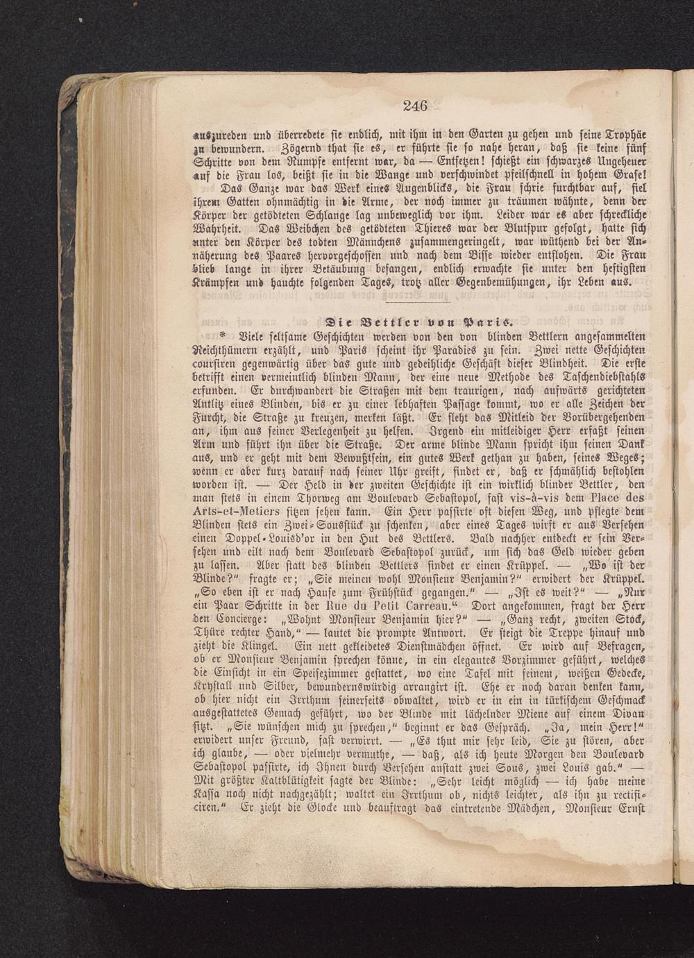 ^ Viele seltsame Geschichten werden von den von blinden Bettlern angesammeltenReichthümern erzählt, und Paris scheint ihr Paradies zu sein. Zwei nette Geschichtencourstrcn gegenwärtig über das gute und gedeihliche Geschäft dieser Blindheit. Die erstebetrifft einen vermeintlich blinden Mann, der eine neue Methode des Taschendiebstahlserfunden. Er durchwandert die Straßen mit dem traurigen, nach aufwärts gerichtetenAntlitz eines Blinden, bis er zu einer lebhaften Passage kommt, wo er alle Zeichen derFurcht, die Straße zu kreuzen, merken läßt. Er fleht das Mitleid der Vorübergehendenan, ihm aus seiner Verlegenheit zu helfen. Irgend ein mitleidiger Herr erfaßt seinenArm und führt ihn über die Straße. Der arme blinde Mann spricht ihm seinen Dankaus, und er geht mit dem Bewußtsein, ein gutes Werk gethan zu haben, seines Weges;wenn er aber kürz darauf nach seiner Nhr greift, findet er, daß er schmählich bestohlcnworden ist. — Der Held in der zweiten Geschichte ist ein wirklich blinder Bettler, denman stets in einem Thorweg am Boulevard Sebastopol, fast vis-ä-vis dem I'Iaoo ckos^rls-ol-Illoliers sitzen sehen kann. Ein Herr passirte oft diesen Weg, und Pflegte demBlinden stets ein Zwei-Sousftück zu schenken, aber eines Tages wirft er aus Verseheneinen Doppel-LouiSd'or in den Hut des Bettlers. Bald nachher entdeckt er sein Ver-sehen und eilt nach dem Boulevard Sebastopol zurück, um sich das Geld wieder gebenzu lassen. Aber statt des blinden Bettlers findet er einen Krüppel. — „Wo ist derBlinde?" fragte er; „Sie meinen wohl Monsieur Benjamin?" erwidert der Krüppel.„So eben ist er nach Hause zum Frühstück gegangen." — „Ist es weit?" — „Nurein Paar Schritte in der liuo ein l'olit Lurrvuu.^ Dort angekommen, fragt der Herrden Concierge: „Wohnt Monsieur Benjamin hier?" — „Ganz recht, zweiten Stock,Thüre rechter Hand," — lautet die prompte Antwort. Er steigt die Treppe hinauf undzieht die Klingel. Ein nett gekleidetes Dienstmädchen öffnet. Er wird auf Befragen,ob er Monsieur Benjamin sprechen könne, in ein elegantes Vorzimmer geführt, welchesdie Einsicht in ein Speisezimmer gestattet, wo eine Tafel mit feinem, weißen Gedecke,Krystall und Silber, bewundernswürdig arrangirt ist. Ehe er noch daran denken kann,ob hier nicht ein Irrthum seinerseits obwaltet, wird er in ein in türkischem Geschmackausgestattetes Gemach geführt, wo der Blinde mit lächelnder Miene auf einem Divansitzt. „Sie wünschen mich zu sprechen," beginnt er das Gespräch. „Ja, mein Herr!"erwidert unser Freund, fast verwirrt. — „Es thut mir sehr leid, Sie zu stören, aberich glaube, — oder vielmehr vermuthe, — daß, als ich heute Morgen den BoulevardSebastopol passirte, ich Ihnen durch Versehen anstatt zwei Sous, zwei Louis gab." —Mit größter Kaltblütigkeit sagte der Blinde: „Sehr leicht möglich — ich habe meineKassa noch nicht nachgezählt; waltet ein Irrthum ob, nichts leichter, als ihn zu rectifi-ciren." Er zieht die Glocke und beauftragt das eintretende Mädchen, Monsieur Ernst