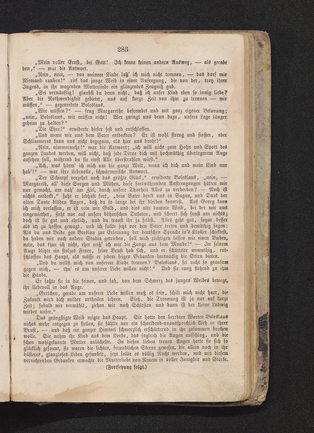 „Gretchcn, gerade um unserer Liebe willen muß es sein, schilt mich nicht hart, dwZukunft wird dich milder urtheilen lehren. Sieh, die Trennung ist ja nur auf kurzeZeit; sobald wir vermählt, ziehen wir nach Schlesien und dann ist der kleine Ludwigwieder unser."