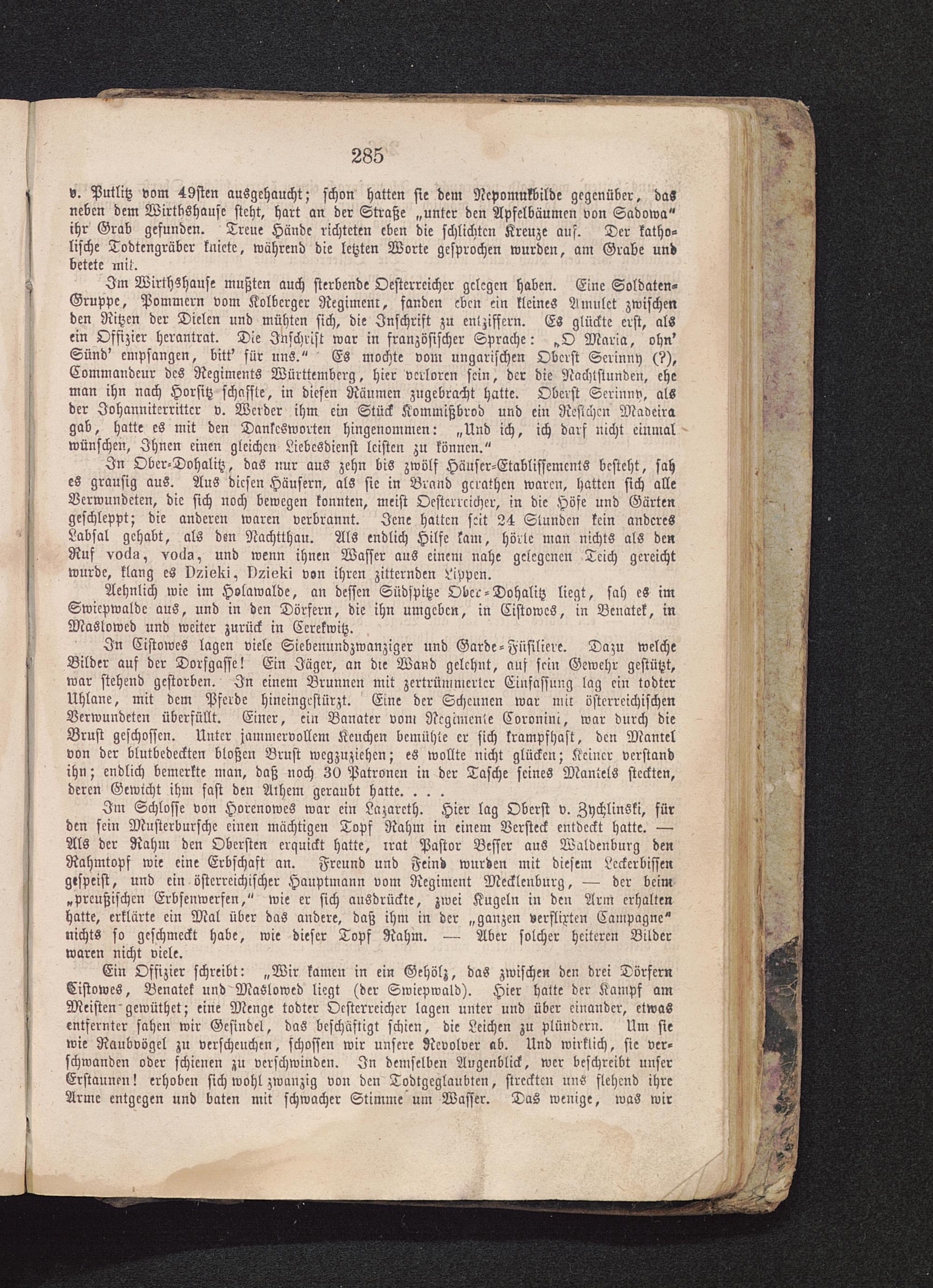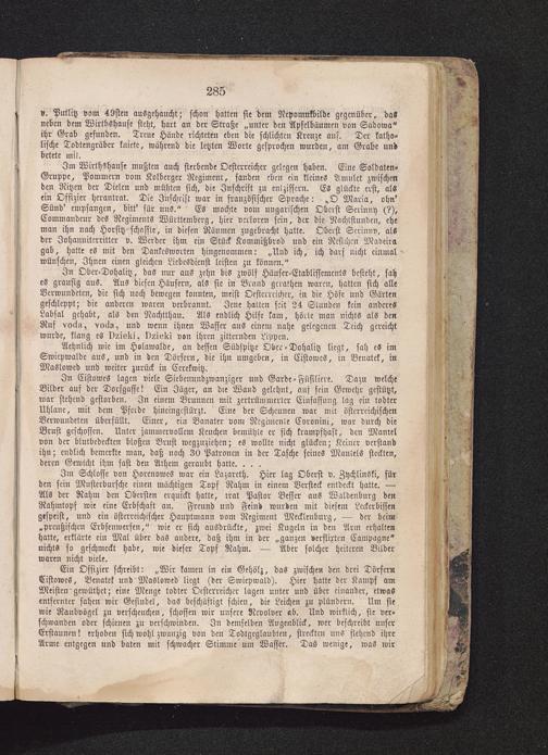 Im Wirthshause mußten auch sterbende Oesterreichcr gelegen haben. Eine Soldaten-Gruppc, Pommern vom Kolbcrger Regimen:, fanden eben ein kleines Amulct zwischenden Ritzen der Dielen und mühten sich, die Inschrift zu entziffern. Es glückte erst, alsein Offizier herantrat. Die Inschrift war in französischer Sprache: „O Maria, ohn'Sünd' empfangen, bitt' für uns." Es mochte von: ungarischen Oberst Scrinny (?),Commandeur des Regiments Württemberg, hier verloren sein, der die Nachtstunden, eheman ihn nach Horsitz schaffte, in diesen Räumen zugebracht hatte. Oberst Scrinny, alsder Iohannitcrrittcr v. Werder ihm ein Stück Kommißbrod und ein Rcsichcn Madeira gab, hatte es mit den Danlcsworten hingenommen: „Und ich, ich darf nicht einmalwünschen, Ihnen einen gleichen Liebesdienst leisten zu können."