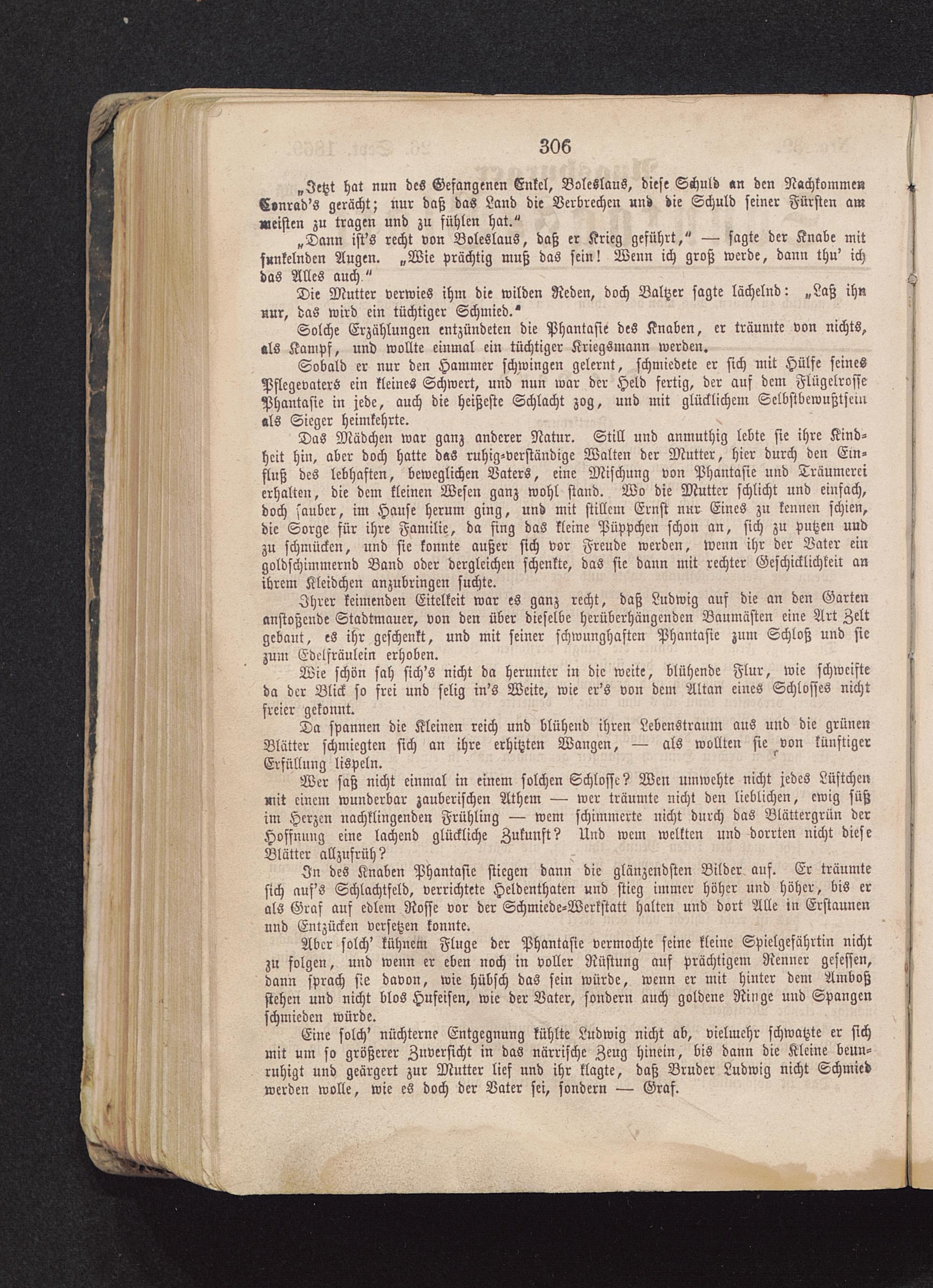 Sobald er nur den Hammer schwingen gelernt, schmiedete er sich mit Hülfe seinesPflegevaters ein kleines Schwert, und nun war der Held fertig, der auf dem FlügelrössePhantasie in jede, auch die heißeste Schlacht zog, und mit glücklichem Selbstbewußtsein«ls Sieger heimkehrte.
