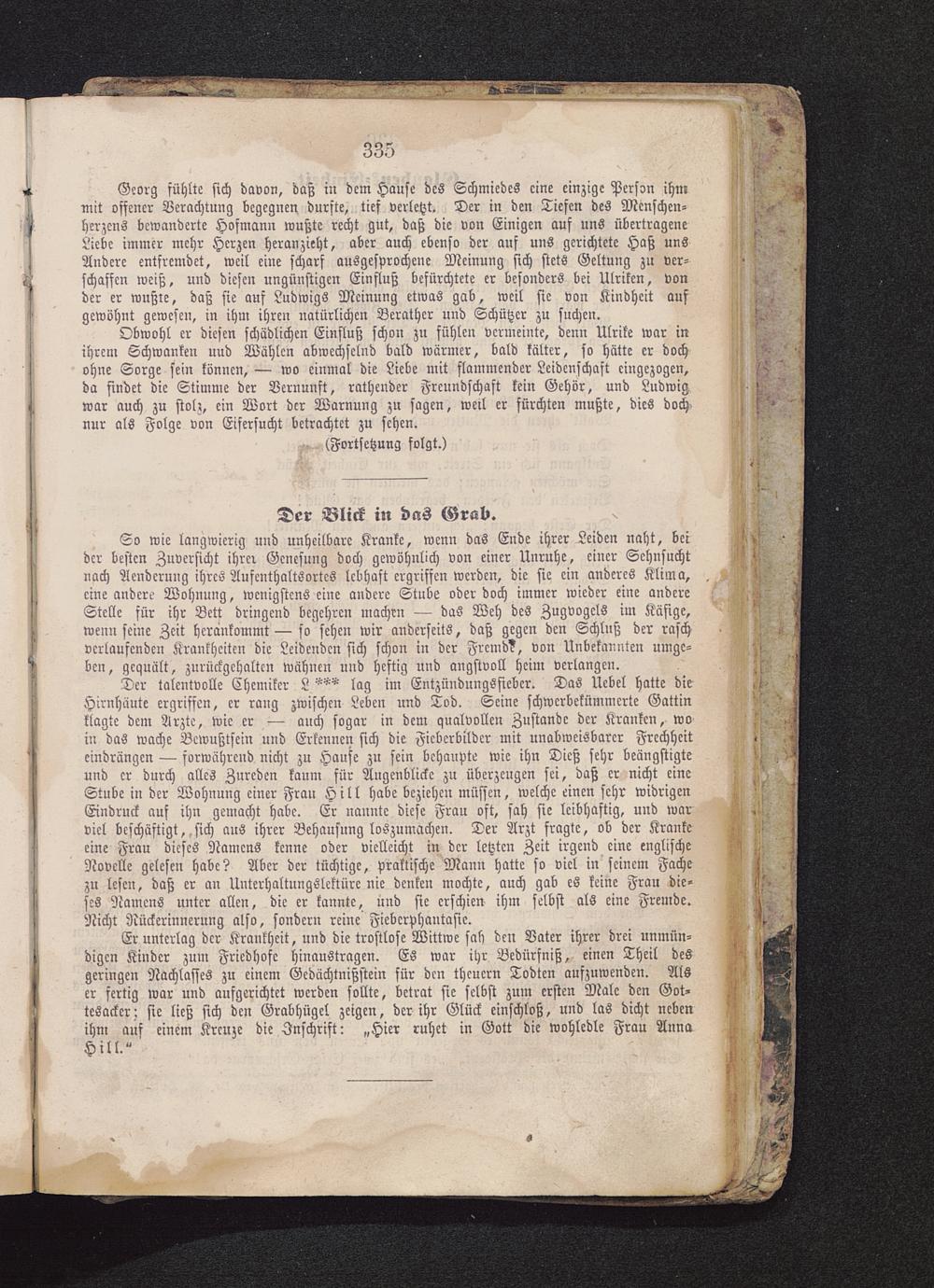 Er unterlag der Krankheit, und die trostlose Wittwe sah den Vater ihrer drei unmün-digen Kinder zum Fricdhofe hinaustragen. Es war ihr Bedürfniß, einen Theil desgeringen Nachlasses zu einem Gedächtnißstein für den theuern Todten aufzuwenden. Alser fertig war und aufgerichtet werden sollte, betrat sie selbst zum ersten Male den Got-tesacker; sie ließ sich den Grabhügel zeigen, der ihr Glück einschloß, und las dicht nebenihm auf einem Kreuze die Inschrift: „Hier ruhet in Gott die Wohledle Frau AnnaHill."