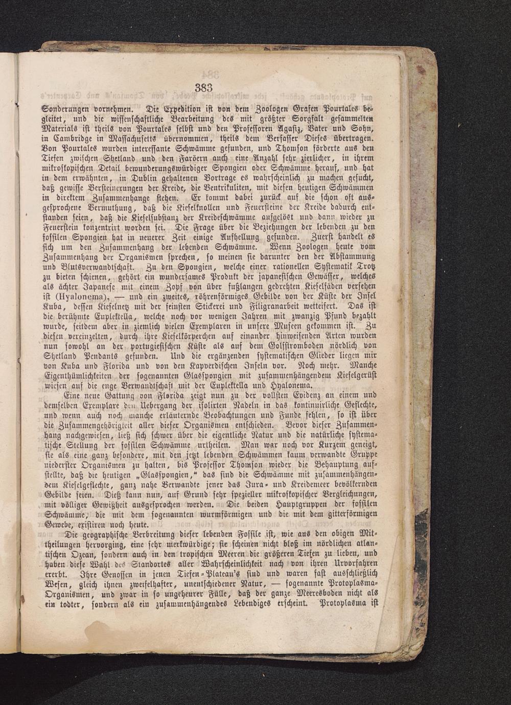 Die geographische Verbreitung dieser lebenden Fossile ist, wie aus den obigen Mit-theilungen hervorging, eine sehr merkwürdige; sie scheinen nicht bloß im nördlichen atlan-tischen Ozean, sondern auch in den tropischen Meeren die größeren Tiefen zu lieben, undhaben diese Wahl des Standortes aller Wahrscheinlichkeit nach von ihren Urvorfahrenererbt. Ihre Genossen in jenen Tiefen-Plateau's sind und waren fast ausschließlichWesen, gleich ihnen zweifelhafter, unentschiedener Natur, — sogenannte Protoplasma-Organismen, und zwar in so ungeheurer Fülle, daß der ganze Meeresboden nicht alsri» todter, sondern als ein zusammenhängendes Lebendiges erscheint. Protoplasma ist