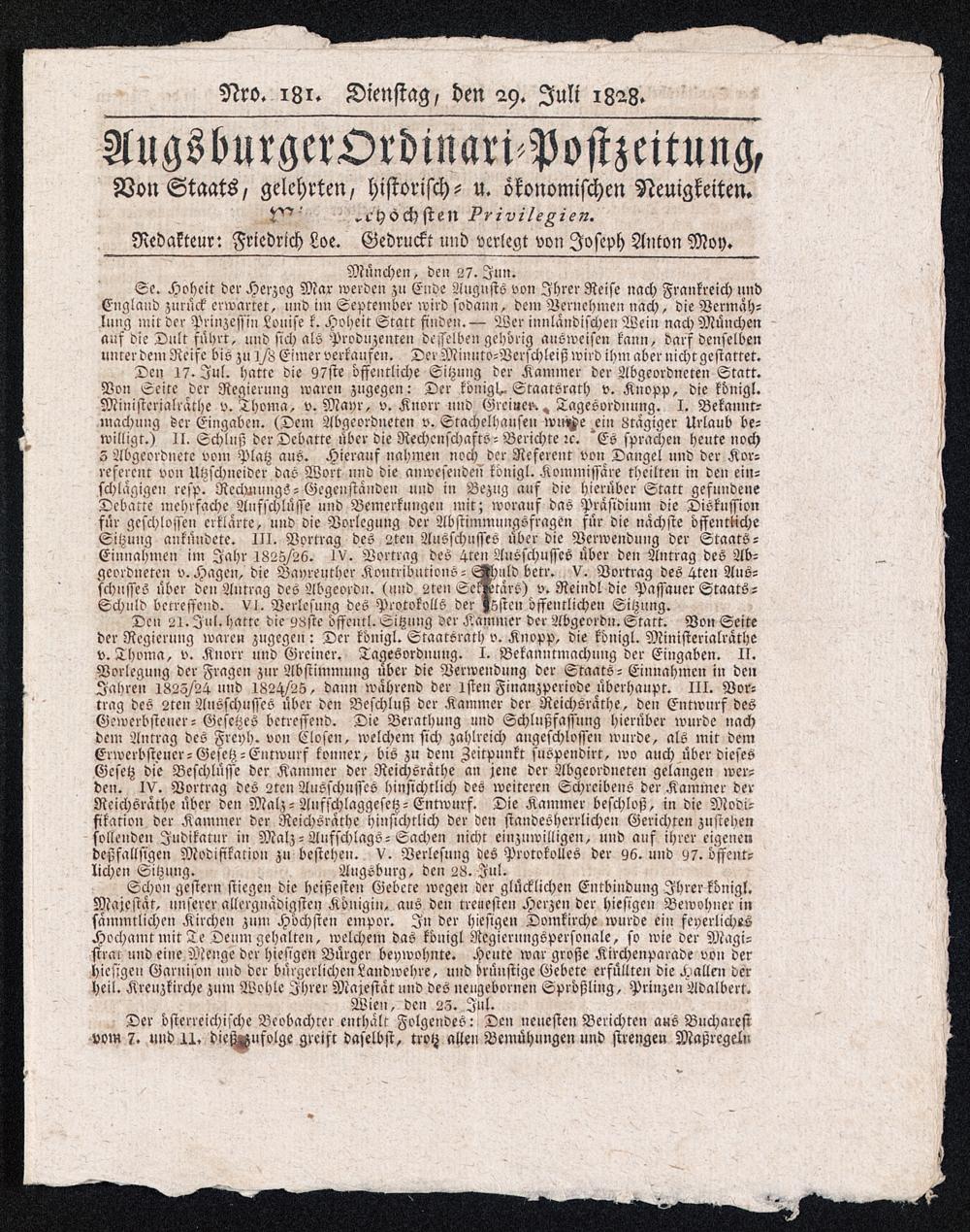 Von Staats, gelehrten, hiſtoriſch⸗ u. oͤkonomiſchen Neuigkeiten.hoͤchſten Privilegien.Redakteur: Friedrich Loe. Gedruckt und verlegt von Joſeph Anton Moy.