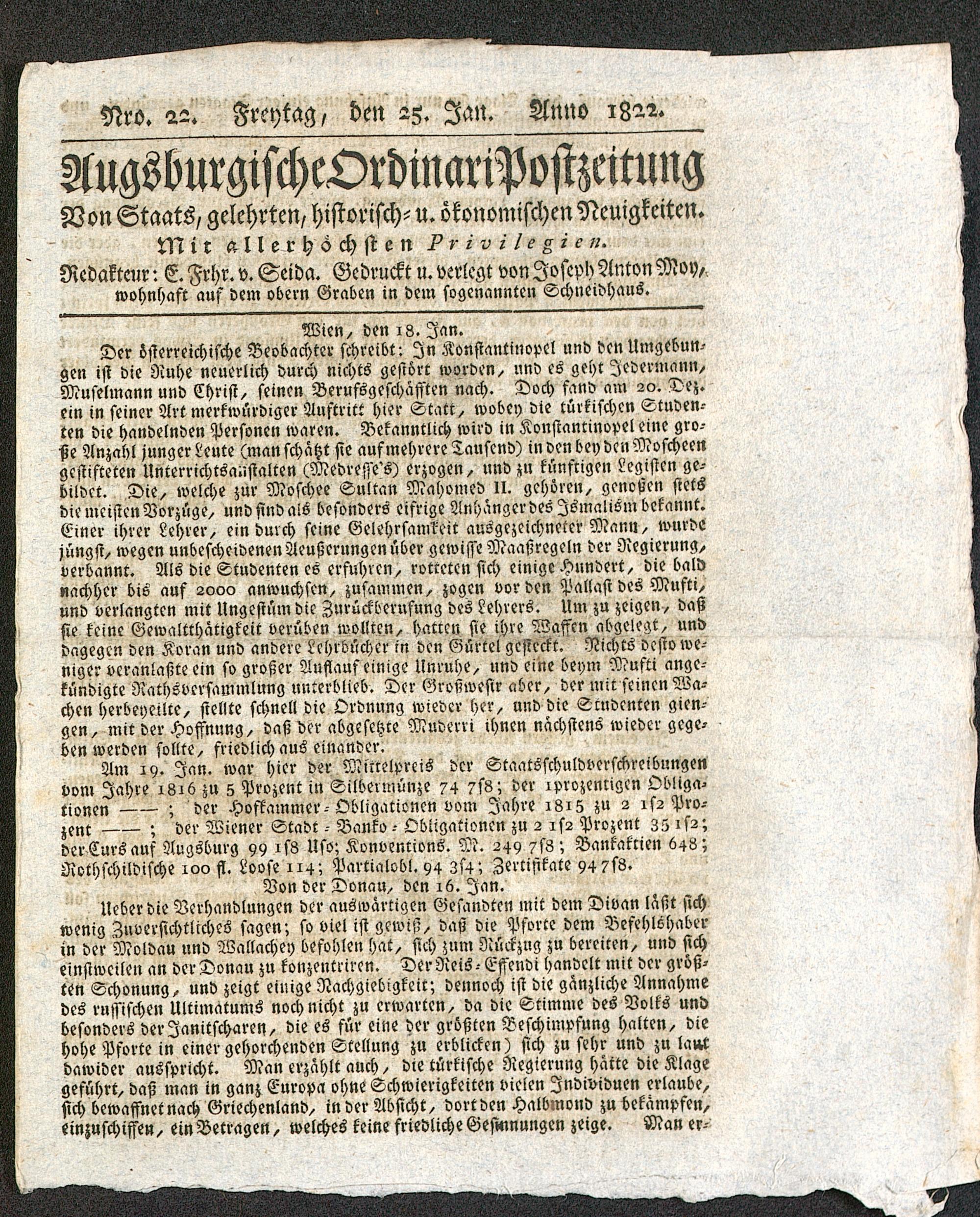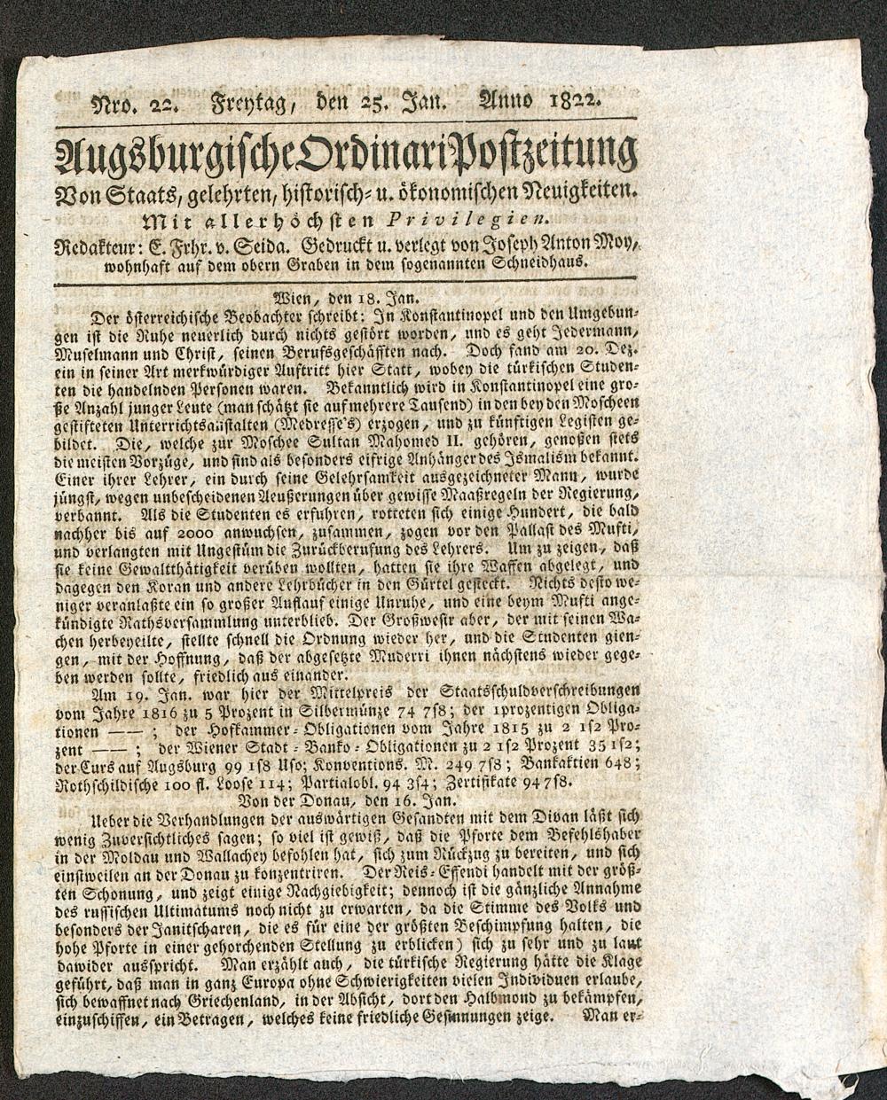 Augsburgische Ordinari Postzeitung. 1811-1822