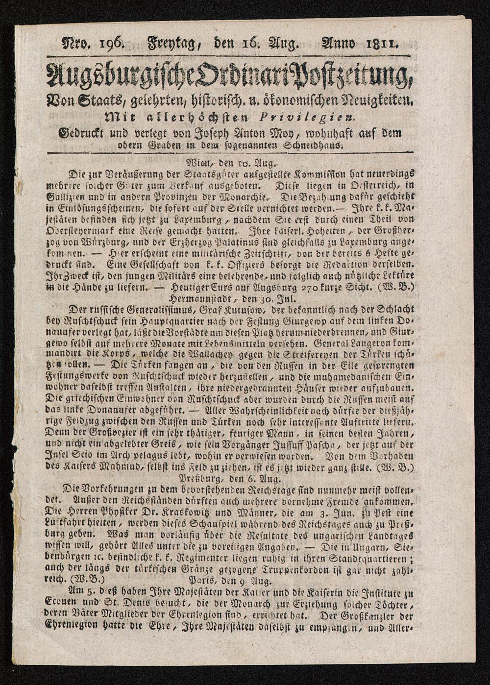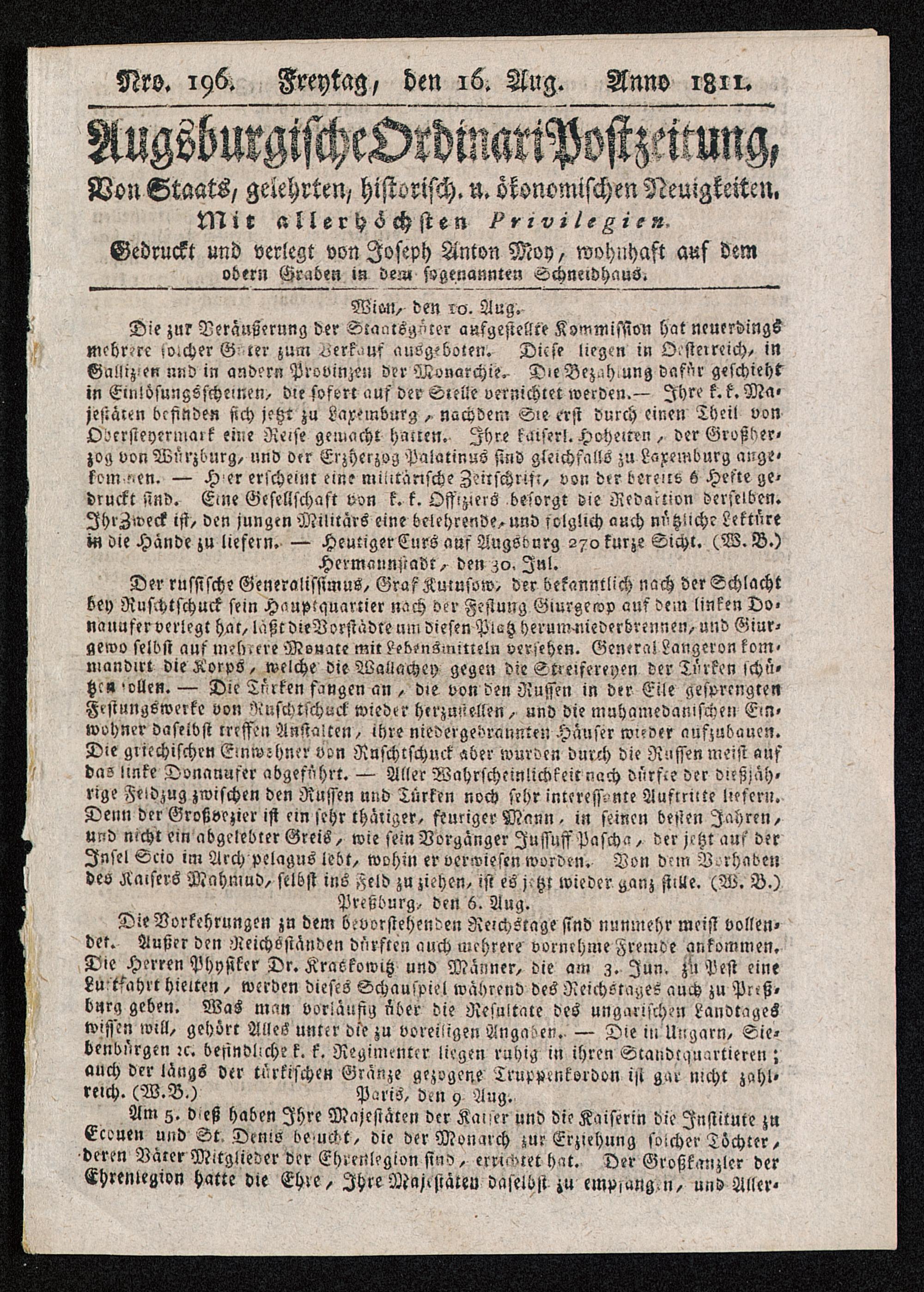 Augsburgische Ordinari Postzeitung. 1811-1822