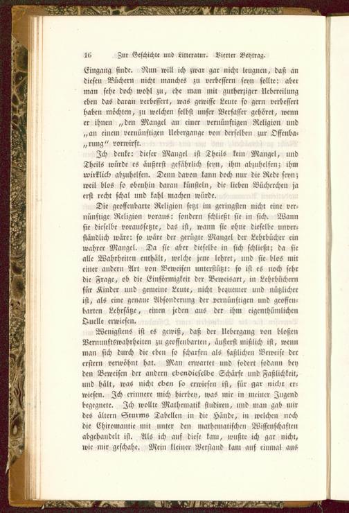 Wenigstens ist es gewiß, daß der Ucbcrgang von blosiciiNcrnunftswahrhcitcn zu geoffenbarten, äußerst mißlich ist, wennman sich durch die eben so scharfen als faßlichen Beweise dererster» verwöhnt hat. Man erwartet und sodcrr sodann beyden Beweisen der andern cbenvicsclbc Schärfe und Faßlichkeit,und hält, was nicht eben so erwiesen ist, für gar nicht er-wiesen. Ich erinnere mich hierbei), was mir in meiner Jugendbegegnete. Zch wollte Mathematik studiren, und man gab mirdes ältern Sturms Tabellen in die Hände, in welchen nochdie Chiromantie mit unter den mathematischen Wissenschaftenabgehandelt ist. Als ich auf diese kam, wußte ich gar nicht,wie mir geschahe. Mein kleiner Berstand kam auf einmal aus