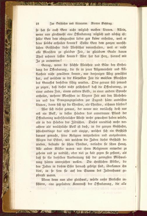 Wer sich dieses getraut, der nenne mir vorläufig doch nurerst ein Volk, in dessen Händen das anvertraute Pfund derOffenbarung wabrschcinlichcr Weise mehr gewuchert haben würde,als in den Händen des Jüdischen. Dieses unendlich mehr ver-achtete als verächtliche Volk ist doch, in der ganzen Geschichte,schlechterdings das erste und einzige, welches sich ein Geschäftdaraus gemacht, seine Religion mitzutheilen und auszubreiten.Wegen des Eifers, mit welchem die Juden dieses Geschäft be-trieben, bestrafte sie schon Christus, verlachte sie schon Horaz .Alle andere Völker waren mit ihren Religionen entweder zugeheim und zu neidisch, oder viel zu kalt gegen sie gesinnt, alsdaß sie für derselben Ausbreitung sich der geringsten Mühwal-tung hätten unterziehen wollen. Die christlichen Völker, dieden Juden in diesem Eifer hernach gefolgt sind, überkamen ihnblos, in so fern sie auf den Stamm des Iudcnthums ge-pfropft waren.