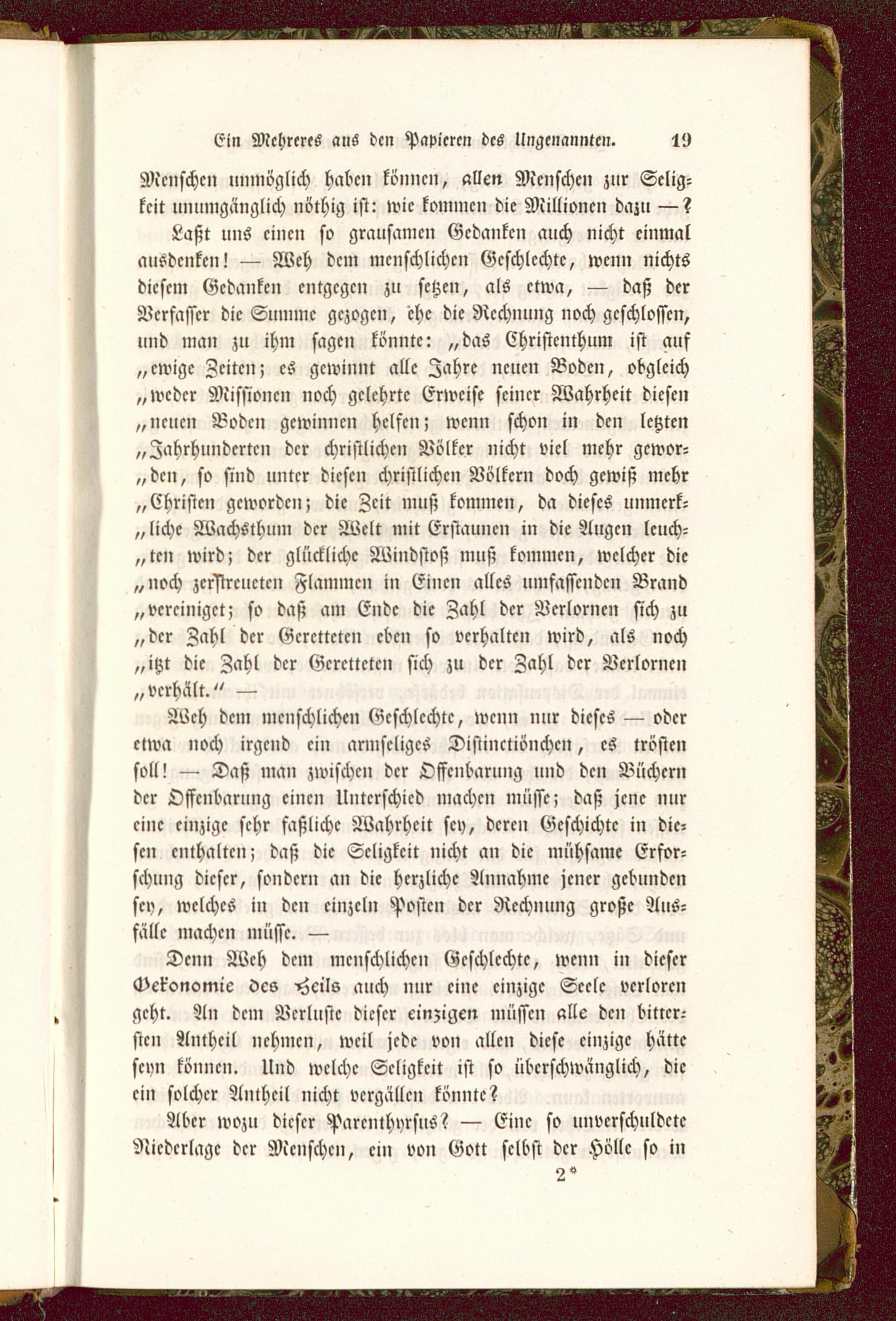 Laßt nns einen so grausamen Gedanken auch nicht einmalansdcnkcn! — Weh dem menschlichen Geschlechte, wenn nichtsdiesem Gedanken entgegen zu setzen, als etwa, — daß derVerfasser die Summe gezogen, ehe die Rechnung Hochgeschlossen,und man zu ihm sagen könnte: „das Christenthum ist auf„ewige Zeiten; es gewinnt alle Jahre neuen Boden, obgleich„weder Missionen noch gelehrte Erweise seiner Wahrheit diesen„neuen Boden gewinnen helfen; wenn schon in den letzten„Jahrhunderten der christlichen Völker nicht viel mehr gewor-den, so sind unter diesen christlichen Völkern doch gewiß mehr„Christen geworden; die Zeit muß kommen, da dieses umncrk-„ liche Wachsthum der Welt mit Erstaunen in die Augen leuch-ten wird; der glückliche Windstoß muß kommen, welcher die„noch zcHrcuctcn Flammen in Einen alles umfassenden Brand„vereiniget; so daß am Ende die Zahl der Verlornen sich zu„der Zahl der Geretteten eben so verhalten wird, als noch„itzt die Zahl der Geretteten sich zu der Zahl der Verlornen„verhält." —