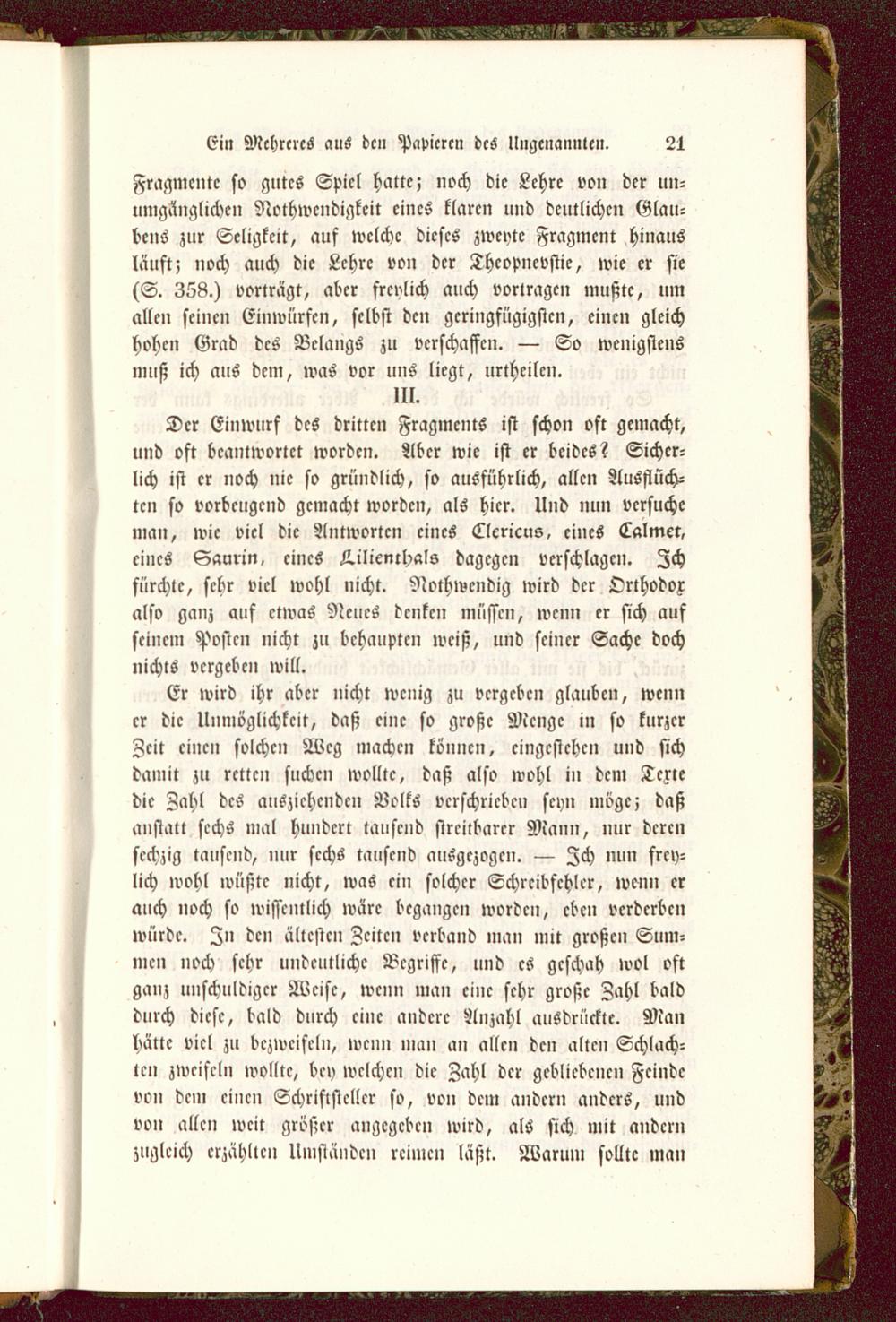 Fragmente so gutes Spiel hatte; noch die Lehre von der u»-»mgäiiglichcii Nothwendigkeit eines klaren und deutlichen Glau-bens zur Seligkeit, auf welche dieses zweyte Fragment hinausläuft; noch auch die Lehre von der Thcopncvstic, wie er sie(S. 358.) vorträgt, aber frcvlich auch vortragen mußte, umallen seinen Einwürfen, selbst den geringfügigsten, einen gleichhohen Grad des Belangs zu verschaffen. — So wenigstensmuß ich aus dem, was vor uns liegt, urtheilen.