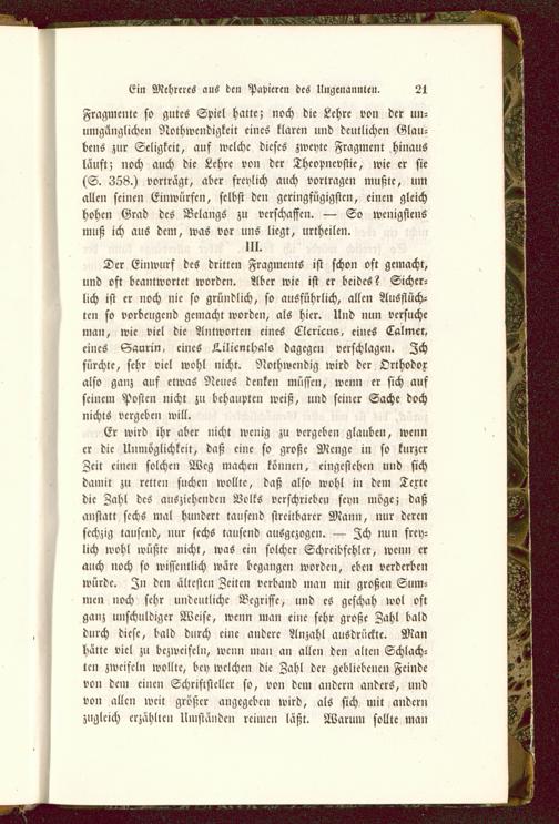 Der Einwurf des dritten Fragments ist schon oft gemacht,und oft beantwortet worden. Aber wie ist er beides? Sicher-lich ist er noch nie so gründlich, so ausführlich, allen Ausflüch-te» so vorbeugend gemacht worden, als hier. Und nun versuchemau, wie viel die Antworten eines Clcricus, eines Calmer,eines Saunn, eines L.ilicnlhals dagegen verschlagen. Zchfurchte, sehr viel wohl nicht. Nothwendig wird der Orthodoxalso ganz auf etwas Neues denken müssen, wenn er sich ausseinem Posten nicht zu behaupten weiß, und seiner Sache dochnichts vergeben will.