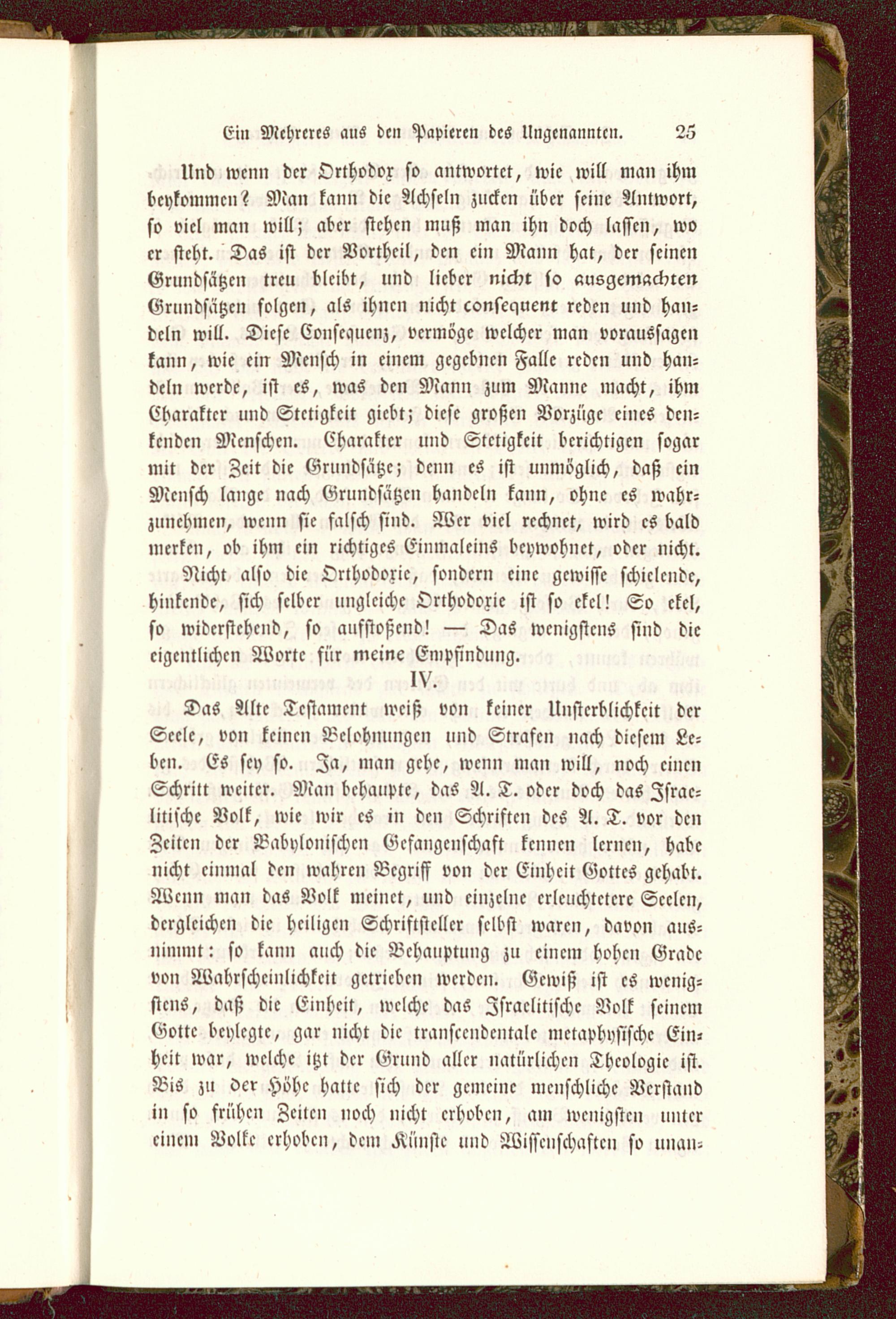 Und wenn der Orthodox so antwortet, wie will man ihmbcykommcn? Man kann die Achseln zucken über seine Antwort,so viel man will; aber stehen muß man ihn doch lassen, woer steht. Das ist der Vortheil, den ein Mann hat, der seinenGrundsätzen treu bleibt, und lieber nicht so ausgemachtenGrundsätzen folgen, als ihnen nicht conscqucnt reden und han-deln will. Diese Conscauenz, vermöge welcher man voraussagenkann, wie ein Mensch in einem gegebnen Falle reden und han-deln werde, ist es, was den Mann zum Manne macht, ihmCharakter und Stetigkeit giebt; diese großen Vorzüge cnics den-kenden Menschen. Charakter und Stetigkeit berichtigen sogarmit der Zeit die Grundsätze; denn es ist unmöglich, daß einMensch lange nach Grundsätzen handeln kann, ohne es wahr-zunehmen, wenn sie falsch sind. Wer viel rechnet, wird es baldmerken, ob ihm ein richtiges Einmaleins beywohnet, oder nicht.