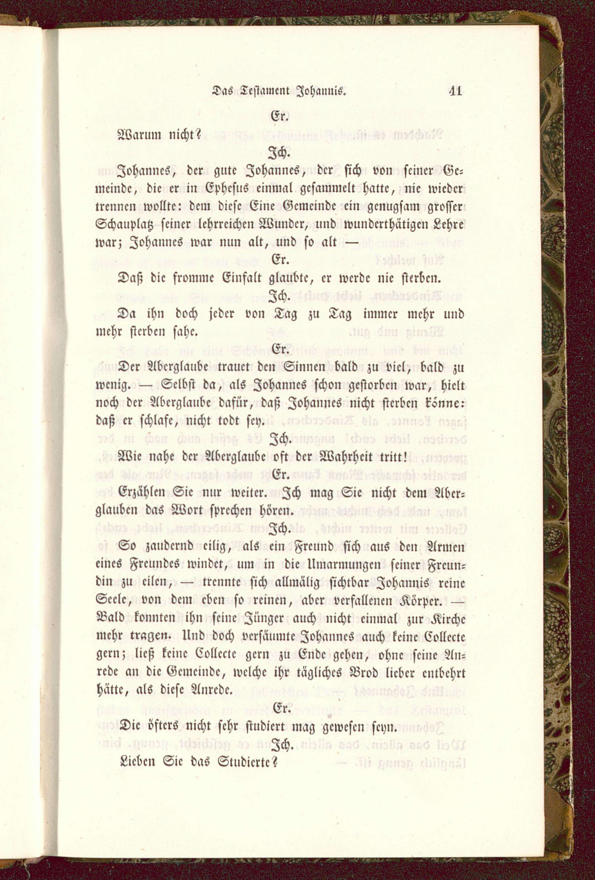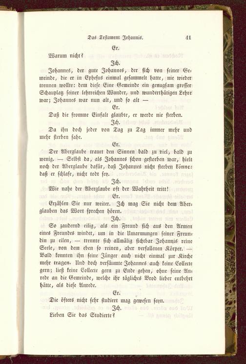 So zaudernd eilig, als ein Freund sich aus den Armeneines Freundes windet, um in die Umarmungen seiner Freun-din zu eilen, — trennte sich allmälig sichtbar Zohannis reineSeele, von dem eben so reinen, aber verfallenen Körper. —Bald konnten ihn seine Jünger auch nicht einmal zur Kirchemehr tragen. Und doch versäumte Johannes auch keine Eollcctcgern; ließ keine Eollcctc gern zu Ende gehen, ohne seine An-rede an die Gemeinde, welche ihr tägliches Brod lieber entbehrthätte, als diese Anrede.