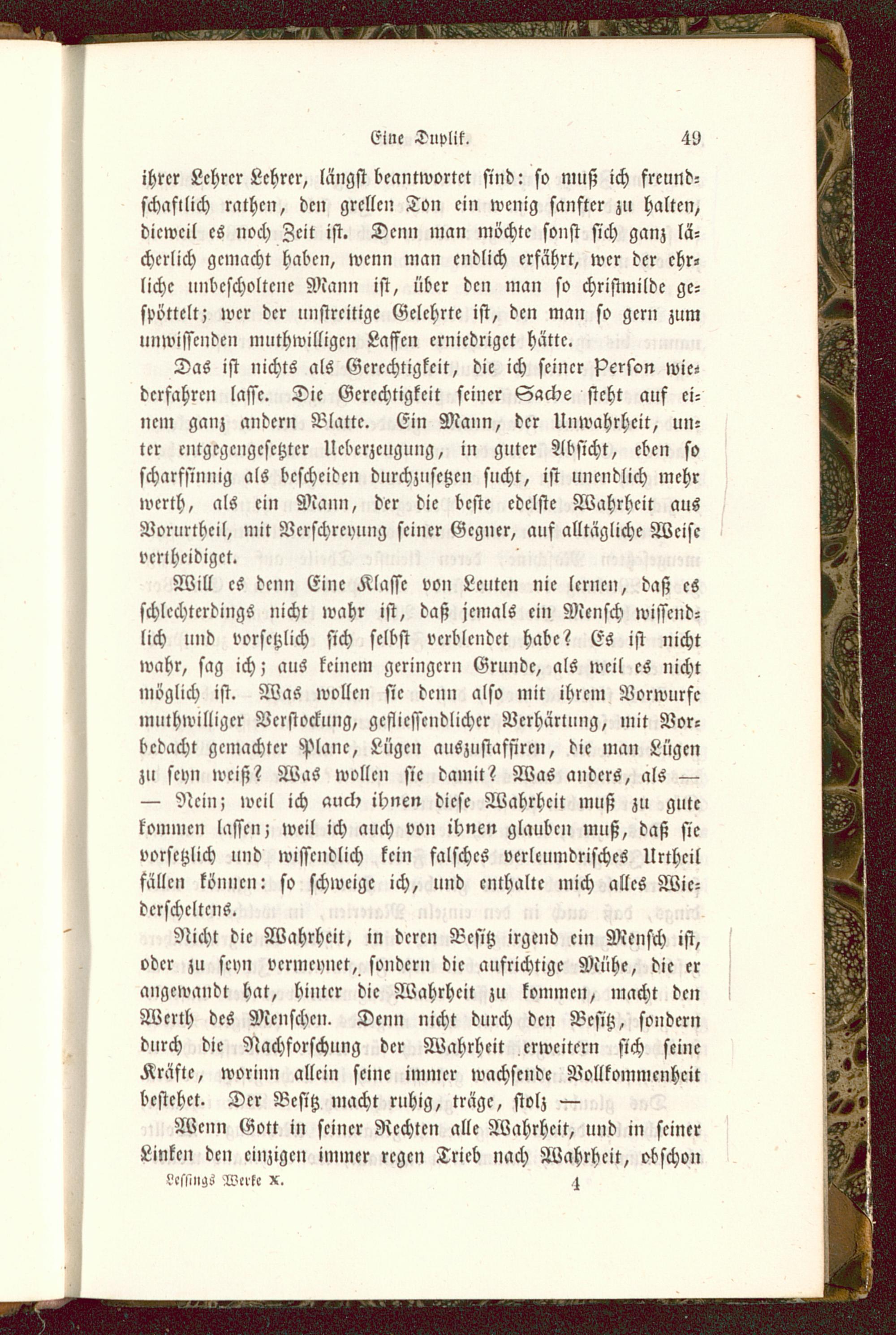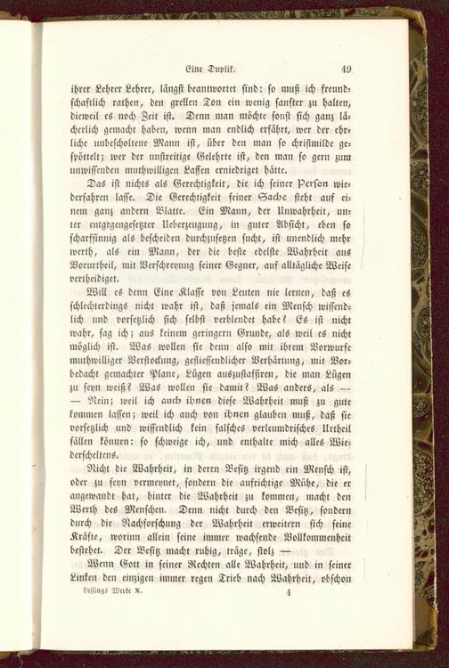 Nicht die Wahrheit, in deren Besitz irgend ein Mensch ist,oder zu sc»in vcrmcynct, sondern die aufrichtige Mühe, die erangewandt hat, hinter die Wahrheit zu kommen, macht denWerth des Menschen. Denn nicht durch den Besitz, sonderndurch die Nachforschung der Wahrheit erweitern sich seineKräfte, worinn allein seine immer wachsende Vollkommenheitbestehet. Der Besitz macht ruhig, träge, stolz —