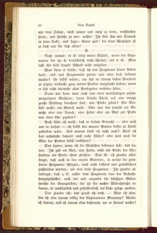 Das leztere, wenn ich die Wahrheit bekennen soll; das lcz-tere. Zch gab ein Rad, eine Feder, nicht als Probe der Uhr;sondern als Probe ihres gleichen. Das ist: ich glaubte aller-dings, daß auch in den einzeln Materien, in welche die gelie-ferten Fragmente schlagen, noch nicht besseres und gründlichcrsgeschrieben worden, als eben diese Fragmente. Zch glaubte al-lerdings, daß z. E. ausser dem Fragmente von der Auscrstc-hungsgeschichtc, noch nie und nirgends die häufigen Wider-sprüche der Evangelisten, die ich für wahre Widersprüche er-kannte, so umständlich und gcflicssendlich ins Licht gesetzt worden.