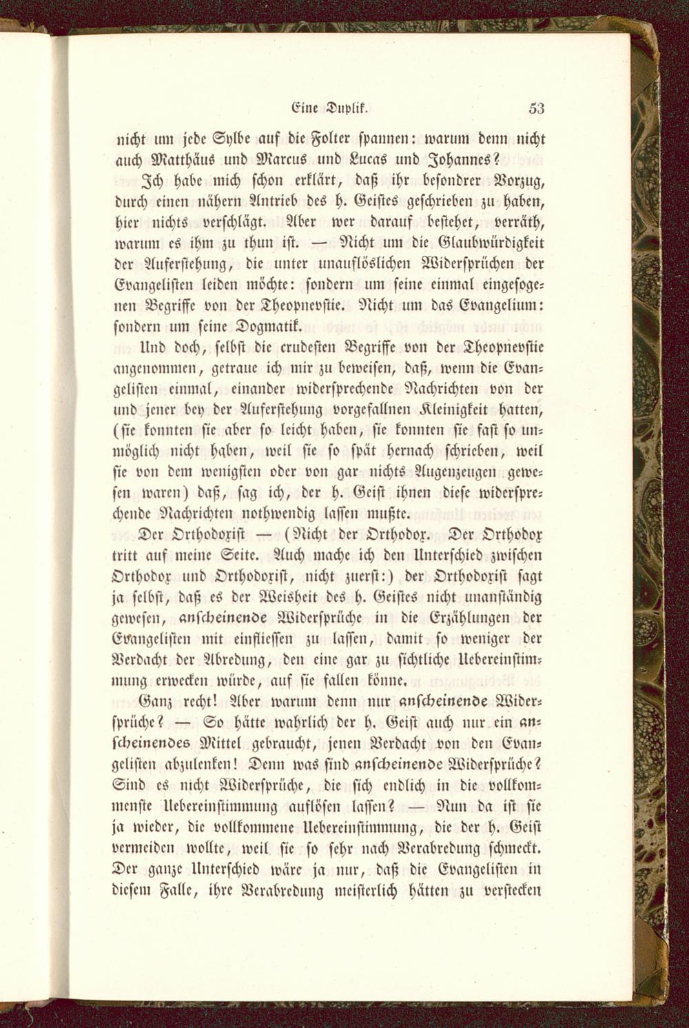 Der Orlhodoxist — (Nicht der Orthodox. Der Orthodoxtritt auf meine Seite. Auch mache ich den Unterschied zwischenOrthodox und Orthodorist, nicht zuerst:) der Orthodoxist sagtja selbst, daß es der Weisheit deS h. Geistes nicht unanständiggewesen, anscheinende Widersprüche in die Erzählungen derEvangelisten mit cinflicsscn zu lassen, damit so weniger derVerdacht der Abrcdung, den eine gar zu sichtliche Uebereinstim-mung erwecken würde, auf sie fallen könne.