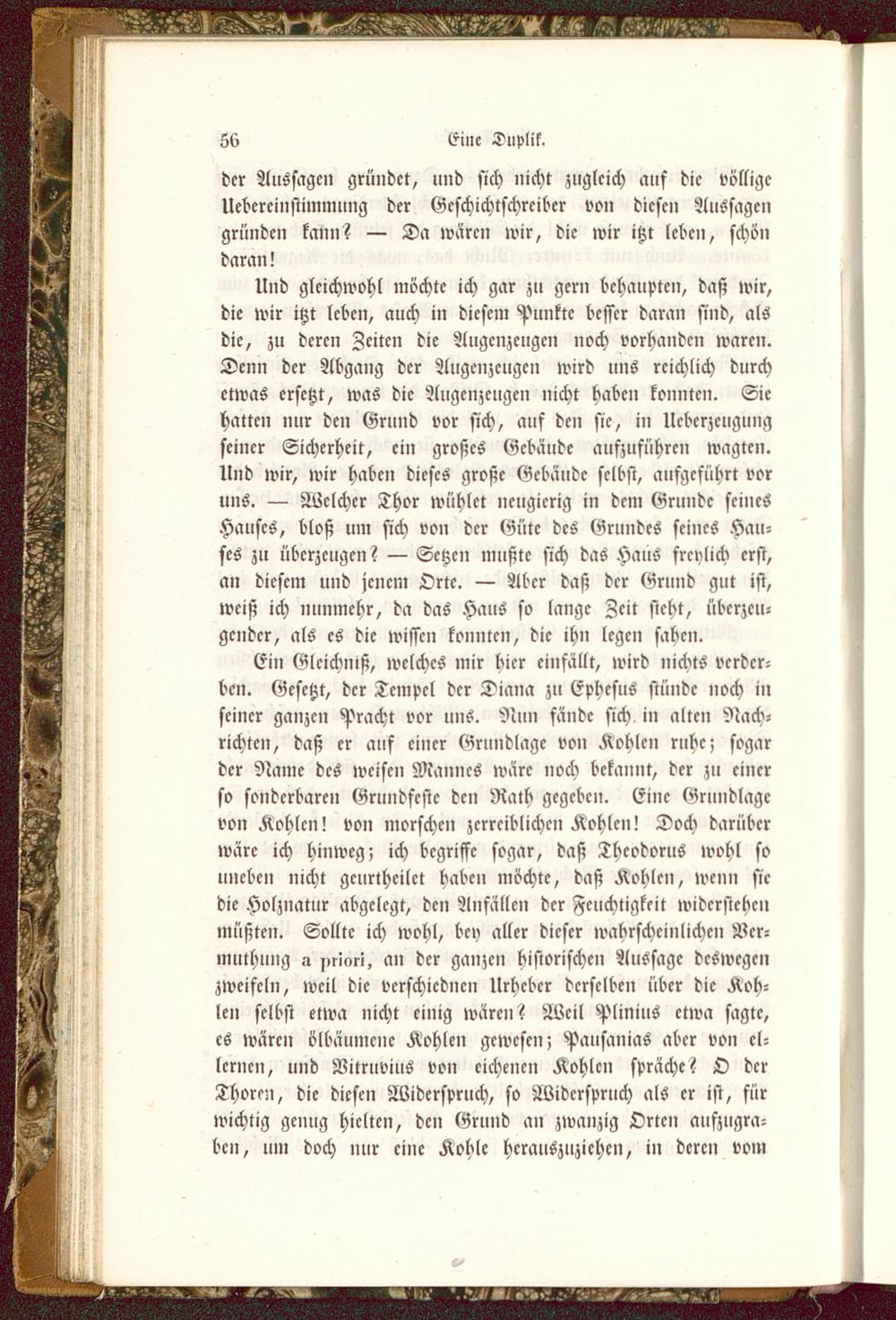 Ein Glcichmß, welches mir hier einfällt, wird nichts verder-ben. Gesetzt, der Tempel der Diana zu Ephesus stünde noch inseiner ganzen Pracht vor uns. Nun fände sich in alten Nach-richten, daß er auf einer Grundlage von Kohlen ruhe; sogarder Name des weisen Mannes wäre noch bekannt, der zu einerso sonderbaren Grundfeste den Rath gegeben. Eine Grundlagevon Kohlen! von morschen zcrrciblichcn Kohlen! Doch darüberwäre ich hinweg; ich begriffe sogar, daß Thcodorus wohl souneben nicht gcurtheilct haben möchte, daß Kohlen, wenn siedie Holznatur abgelegt, den Anfällen der Feuchtigkeit widerstehenmüßten. Sollte ich wohl, bey aller dieser wahrscheinlichen Ver-muthung a priori, an der ganzen historischen Aussage deswegenzweifeln, weil die vcrschicdncn Urheber derselben über die Koh-len selbst etwa nicht einig wären? Weil Plinius etwa sagte,es wären ölbäumcnc Kohlen gewesen; Pausanias aber von el-lcrncn, und Vitruvius von eichenen Kohlen spräche? O derThoren, die diesen Widerspruch, so Widerspruch als er ist, fürwichtig genug hielten, den Grund an zwanzig Orten aufzugra-ben, um doch nur eine Kohle herauszuziehen, in deren vom