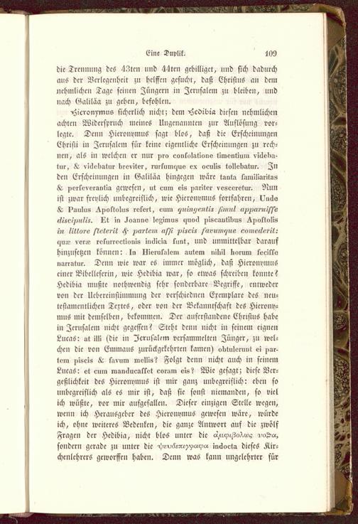 ^zicrory-mns sicherlich nicht; dem Hedibi« diesen nehmlichenachten Widerspruch meines Ungenannten zur Auflösung vor-legte. Denn HicronymuS sagt blos, daß die ErscheinungenChristi in Jerusalem für keine eigentliche Erscheinungen zu rech-nen, als in welchen er nur pro conlolationo timontimu viäen.i-tur, >k vuleliatur droviter, rurtumc^uo ex ocuüs tollvbatur. Inden Erscheinungen in Galilaa hingegen wäre taow fumiliaritsK^ perteversiitia gewesen, ut eum vis püriter voscoretur. ?cUNist zwar freylich unbegreiflich, wie Hicronvmus fortfahren, llnäc-^ Paulus ^noktolus rvsert, «:um ^?«t'nA«?i<» //,/,?t^ tt^^«??<///'et^'6c//i»/i5. Lt in ^oannv Ii?zimus nuoll plscaut'iuus ^pvstolls«i //tto?'« /7o<e?/t ^«»-te?» n/)? ^/Fc» /'ttvittn^»e eo?ne</e?-t^.-«zuN ver-v resurreetionis inuicia tunt, und unmittelbar daraufhinzusetzen können: I» Lierufiilom autem niliil Iwrum feLisk«!narr-ttur. Denn wie war es immer möglich, daß Hicronymuseiner Bibcllcscrin, wie Hcdibia war, so etwas schreiben konnte?Hcdibia mußte nothwendig sehr sonderbare Begriffe, entwedervon der Uebereinstimmung der vcrschicdncn Ercmplare des ncu-tcstamcntlichcn Tcrtes, oder von der Bekanntschaft des Hicrony-mus mit demselben, bekommen. Der auferstandene Christus habein Jerusalem nicht gegessen? Steht denn nicht in seinem eignenLucas: at ill! (die in Jerusalem versammelten Jünger, zu wel-chen die von Emmaus zurückgekehrten kamen) outuloiunt <z! par-tom piscis ^ favum mc-IIis? Folgt denn nicht auch in seinemLucas: ot cum manclucartot cor-tm e!s? Wie gesagt; diese Ver-geßlichkeit des HicronymuS ist mir ganz unbegreiflich: eben sounbegreiflich als es mir ist, daß sie sonst niemanden, so vielich wüßte, vor mir aufgefallen. Dieser einzigen Stelle wegen,wenn ich Herausgeber des HicronymuS gewesen wäre, würdeich, ohne weiteres Bedenken, die ganze Antwort auf die zwölfFragen der Hcdibia, nicht blos unter die «^cp^Zo7.<o-; voA-«,sondern gerade zu unter die ^^ck-ic^o-cp« inäocta dieses Kir-chenlehrers gcworffen haben. Denn was kann ungelchrter für