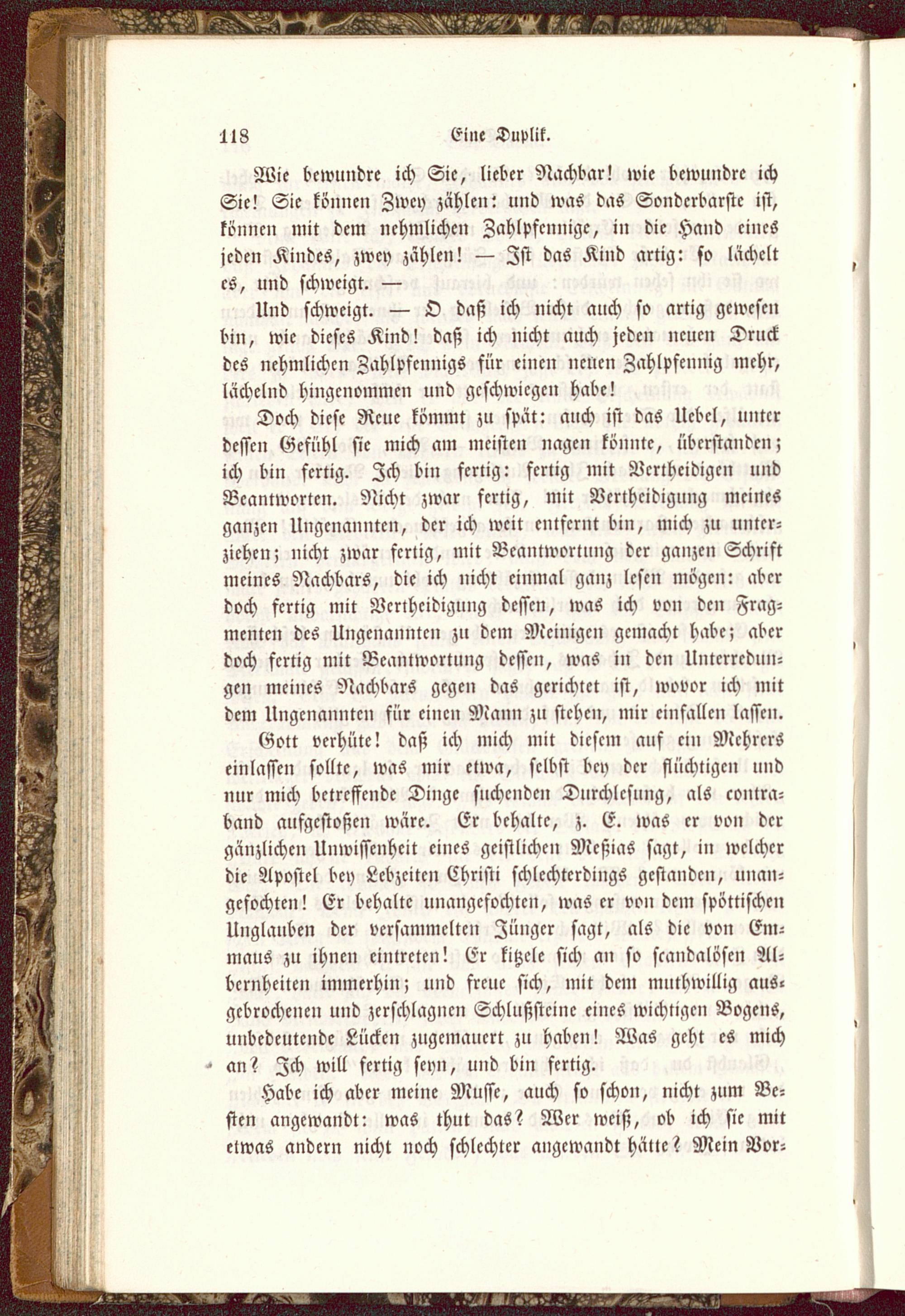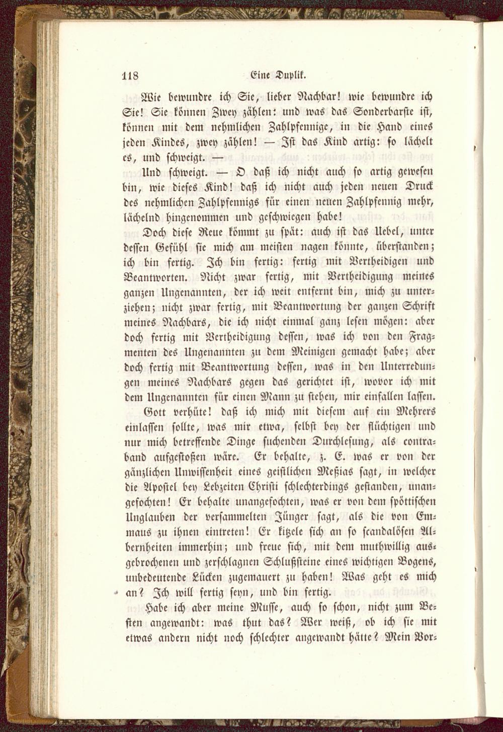Doch diese Reue kömmt zu spät: auch ist das Uebel, unterdessen Gefühl sie mich am meisten nagen könnte, überstanden;ich bin fertig. Zch bin fertig: fertig mit Vertheidigen undBeantworten. Nicht zwar fertig, mit Vertheidigung meinesganzen Ungenannten, der ich weit entfernt bin, mich zu unter-ziehen; nicht zwar fertig, mit Beantwortung der ganzen Schriftmeines Nachbars, die ich nicht einmal ganz lesen mögen: aberdoch fertig mit Vertheidigung dessen, was ich von den Frag-menten des Ungenannten zu dem Mcinigcn gemacht habe; aberdoch fertig mit Beantwortung dessen, was in den Unterredun-gen meines Nachbars gegen das gerichtet ist, wovor ich mitdem Ungenannten für einen Mann zu stehen, mir einfallen lassen.