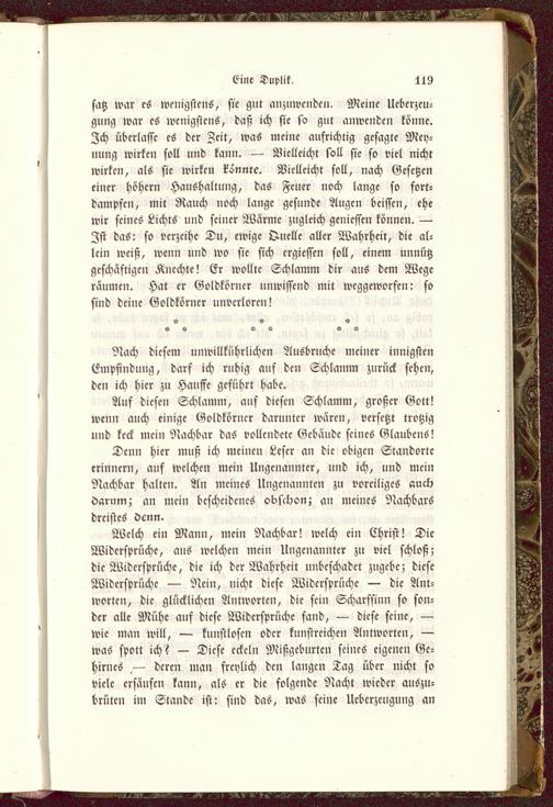 Denn hier muß ich meinen Leser an die obigen Standorteerinnern, auf welchen mein Ungenannter, und ich, und meinNachbar halten. An meines Ungenannten zu voreiliges auchdarum; an mcin bcschcidcncs obschon; an meines Nachbarsdreistes denn.