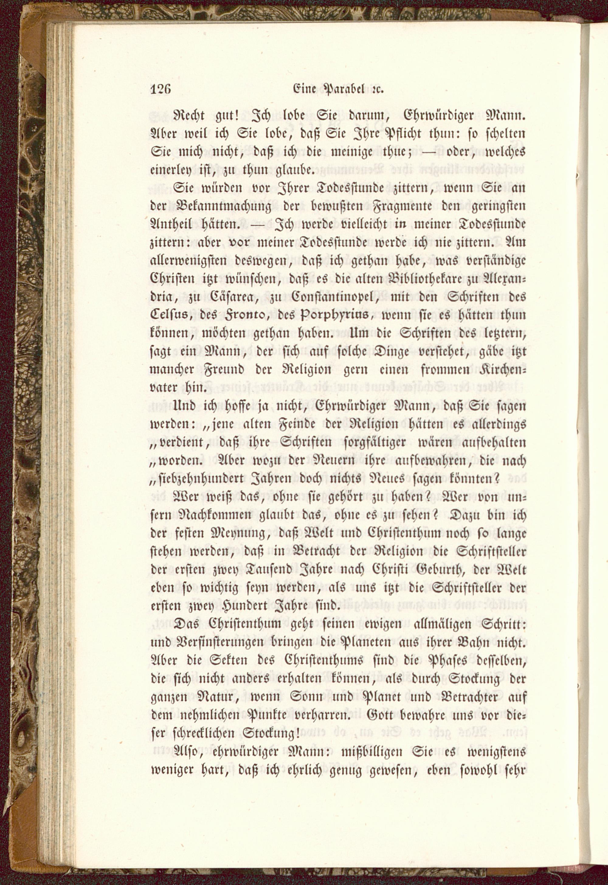Und ich hoffe ja nicht, Ehrwürdiger Mann, daß Sie sagenwerden: „jene alten Feinde der Religion hätten es allerdings„verdient, daß ihre Schriften sorgfältiger wären aufbehalten„worden. Aber wozu der Neuern ihre aufbewahren, die nach„siebzchnhundcrt Jahren doch nichts Neues sagen könnten?