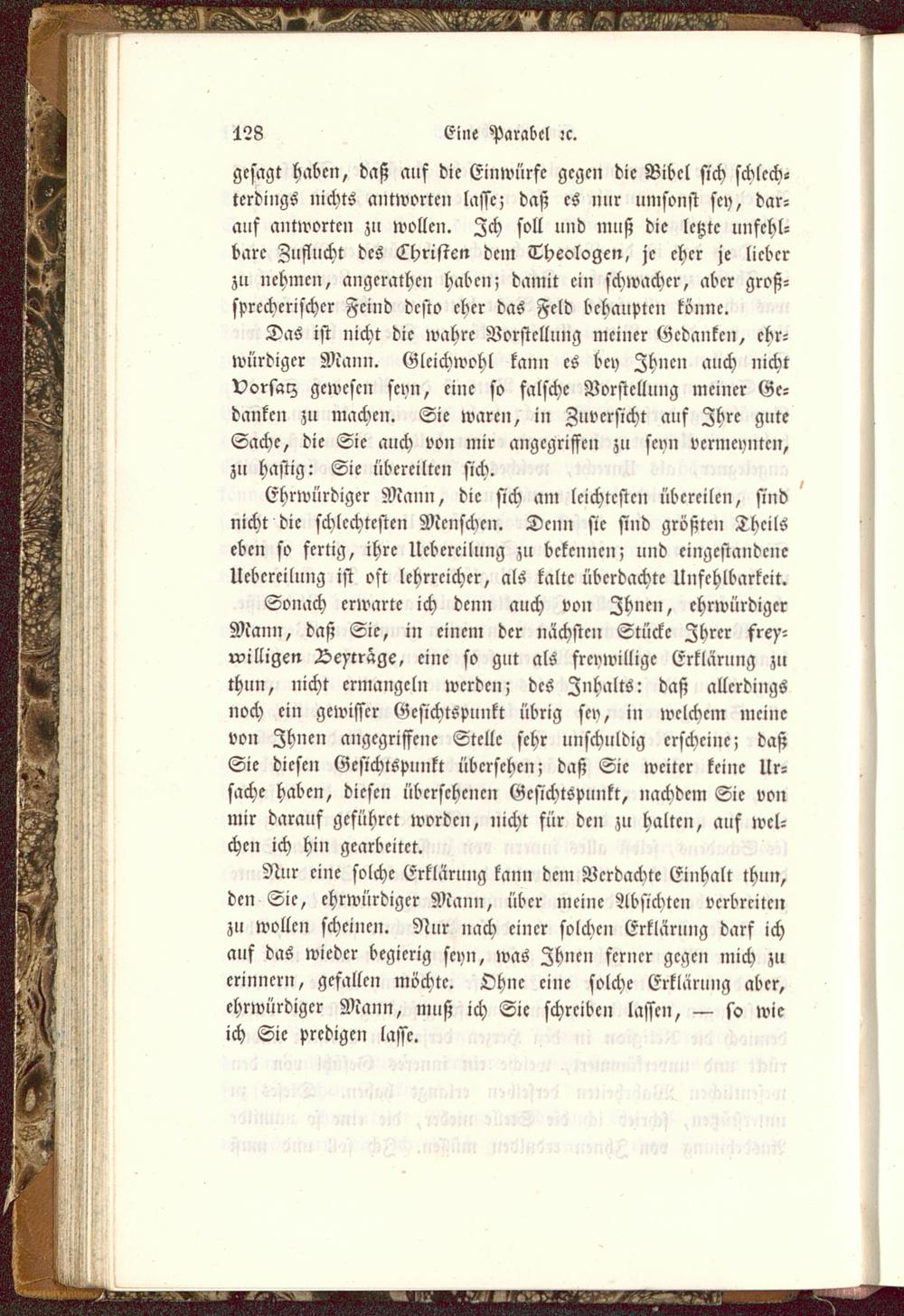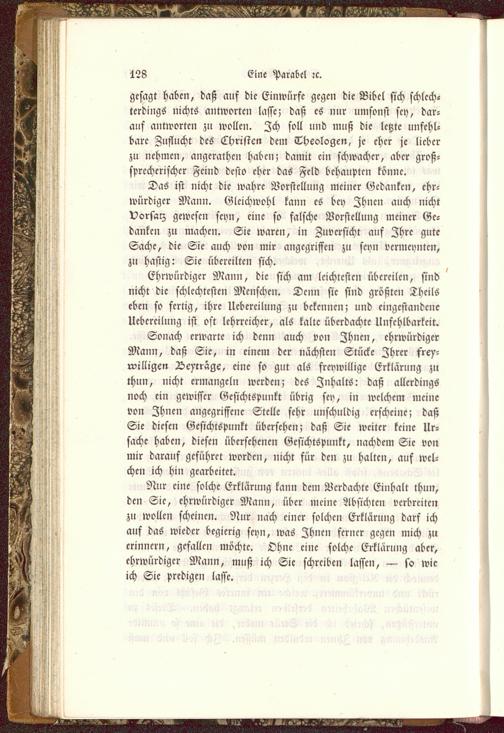 Sonach erwarte ich denn auch von Ihnen, ehrwürdigerMann, daß Sie, in einem der nächsten Stücke Ihrer frei-willigen Betrage, eine so gut als srcvwilligc Erklärung zuthun, nicht ermangeln werden; des Inhalts: daß allerdingsnoch ein gewisser Gesichtspunkt übrig scv, in welchem meinevon Ihnen angegriffene Stelle sehr unschuldig erscheine; daßSie diesen Gesichtspunkt übersehen; daß Sie weiter keine Ur-sache haben, diesen übcrschcncn Gesichtspunkt, nackdcm Sie vonmir darauf gcführct worden, nicht für den zu halten, auf wel-chen ich hin gearbeitet.
