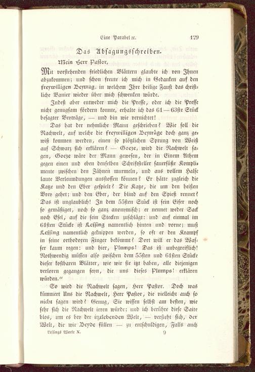 Das hat der nehmliche Mann geschrieben? Wie soll dieNacbwclt, auf welche die frcyrvilligen Beyträge doch ganz ge-wiß kommen werden, einen so plötzlichen Sprung von Weißaus Schwarz sich erklären? — Gocze, wird die Nachwelt sa-gen, Gocze wäre der Mann gewesen, der in Einem Athemgegen einen und eben denselben Schriftsteller sauersüße Kompli-mente zwischen den Zähnen murmeln, und aus vollem Halselaute Verleumdungen auostossen können? Er hätte zugleich dieKatze und den Eber gespielt? Die Katze, die um den heißenBrcn gehet? und den Eber, der blind auf den Spieß rennet?Das ist unglaublicb! Zn dem Z5sten Stück ist sein Eifer nochso gcmäßigct, noch so ganz anonvmisch; er nennet weder Sacknoch Esel, auf die sein Stecken zuschlägt: und auf einmal imlösten Stücke ist L.cssing namentlich hinten und vorne; mußMessing namcntlick gcknippcn werden, so oft er den Krampfin seine ortbodorcn Finger bekömmt? Dort will er daS Was-ser kaum regen: und hier, Plumps! Das ist unbcgrcislich!Nothwendig müssen also zwiscben dem 55stcn und Kisten Stückedieser kostbaren Blätter, wie wir sie itzt baben, alle diejenigenverloren gegangen scvn, die »ns dieses Plumps! erklärenwürden."