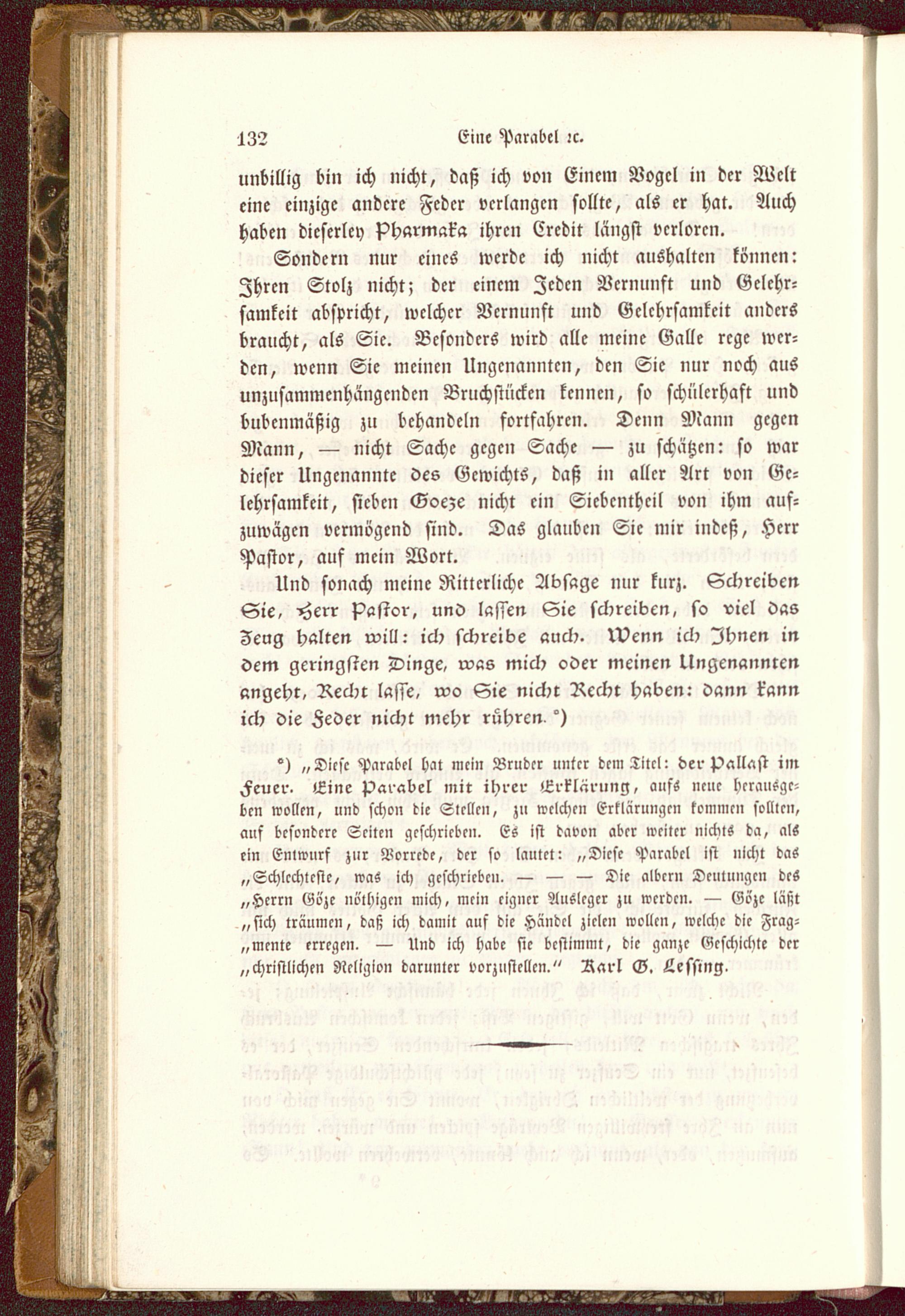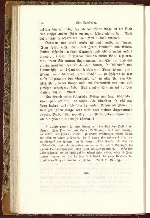 °) „Dicsc Parabel hat mein Bruder unter dem Titel: der pallast imFeuer, Eine Parabel mit ihrer Erklärung, aufs neue herausge-ben wollen, und schon die Stellen, zu welchen Erklärungen kommen sollten,auf besondere Seilen geschrieben. Es ist davon aber weiter nichts da, alsein Entwurf zur Borrede, der so lautet: „Dicsc Parabel ist nicht das„Schlechteste, was ich gcschricbcu. — — — Dic albcr» Deutungen deS„Herrn Goze no'lhigc» mich, mein eigner Ausleger zu wcrdcn. — Eözc läsjt„sich träumen, daß ich damit auf die Händel zielen wollen, welche die Frag-mente erregen, — Und ich habe sie bestimmt, die ganze Geschichte der„christlichen Religion darunter vorzustellen," Rarl G. Lessing,