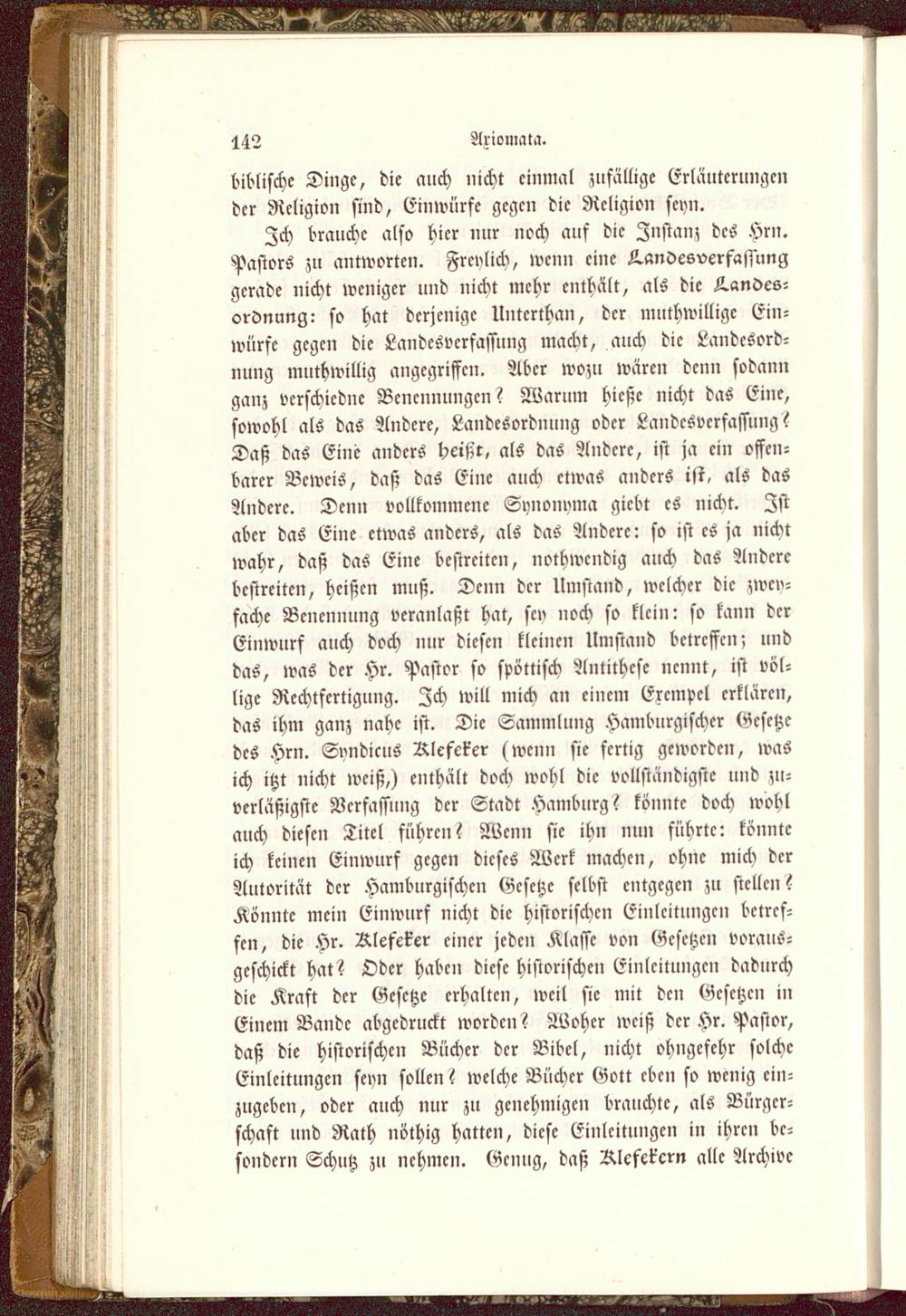 Ich brauche also hier nur noch auf die Instanz des Hrn.Pastors zu antworten. Frcvlick, wenn eine Landesverfassunggerade nicht weniger und nicht mehr enthält, als die Ä.anöcs-ordnung: so hat derjenige Unterthan, der muthwilligc Ein-würfe gegen die Landesverfassung macbt, auch die Landcsord-nung muthwillig angegriffen. Aber wozu wären denn sodannganz verschicdnc Benennungen? Warum hieße nicht das Eine,sowohl als das Andere, Landcsordnung oder Landesverfassung?Daß das Eine anders hcisit, als das Andere, ist ja ein offen-barer Beweis, daß das Eine auch etwas anders ist, als dasAndere. Denn vollkommene Synonyma giebt es nicht. Istaber das Eine etwas anders, als das Andere: so ist es ja nicktwahr, daß das Eine bestreiken, nothwendig auch das Anderebestreiken, heißen muß. Denn der Umstand, welcher die zwei-fache Benennung veranlaßt hat, scv noch so klein: so kann derEinwurf auch doch nur diesen kleinen Umstand betreffen; unddas, was der Hr. Pastor so spöttisch Antithese nennt, ist völ-lige Rechtfertigung. Ich will mick an einem Ercmpcl erklären,das ihm ganz nahe ist. Die Sammlung Hamburgischcr Gesetzedes Hrn. Syndicus Rlcfeker (wenn sie fertig geworden, wasich itzt nicht weiß,) enthält doch wohl die vollständigste und zn-verläßigste Verfassung der Stadt Hamburg ? könnte doch wohlauch diesen Titel führen? Wenn sie ihn nun führte: könnteich keinen Einwurf gegen dieses Werk machen, ohne mich derAutorität der Hamburgischcn Gesetze selbst entgegen zu stellen?Könnte mein Einwurf nicht die historischen Einleitungen betref-fen, die Hr. Rlefcker einer jeden Klasse von Gesetzen voraus-geschickt hat? Oder haben diese historischen Einleitungen dadurchdie Kraft der Gesetze erhalten, weil sie mit den Gesetzen inEinem Bande abgedruckt worden? Woher weiß der Hr. Pastor,daß die historischen Bücher der Bibel, nicht ohngcfehr solcheEinleitungen seyn sollen? welche Bücher Gott eben so wenig ein-zugeben, oder auch nur zu genehmigen brauchte, als Bürger-schaft und Rath nöthig hatten, diese Einleitungen in ihren be-sondern Schutz zu nehmen. Genug, daß Rlcfekcrn alle Archive