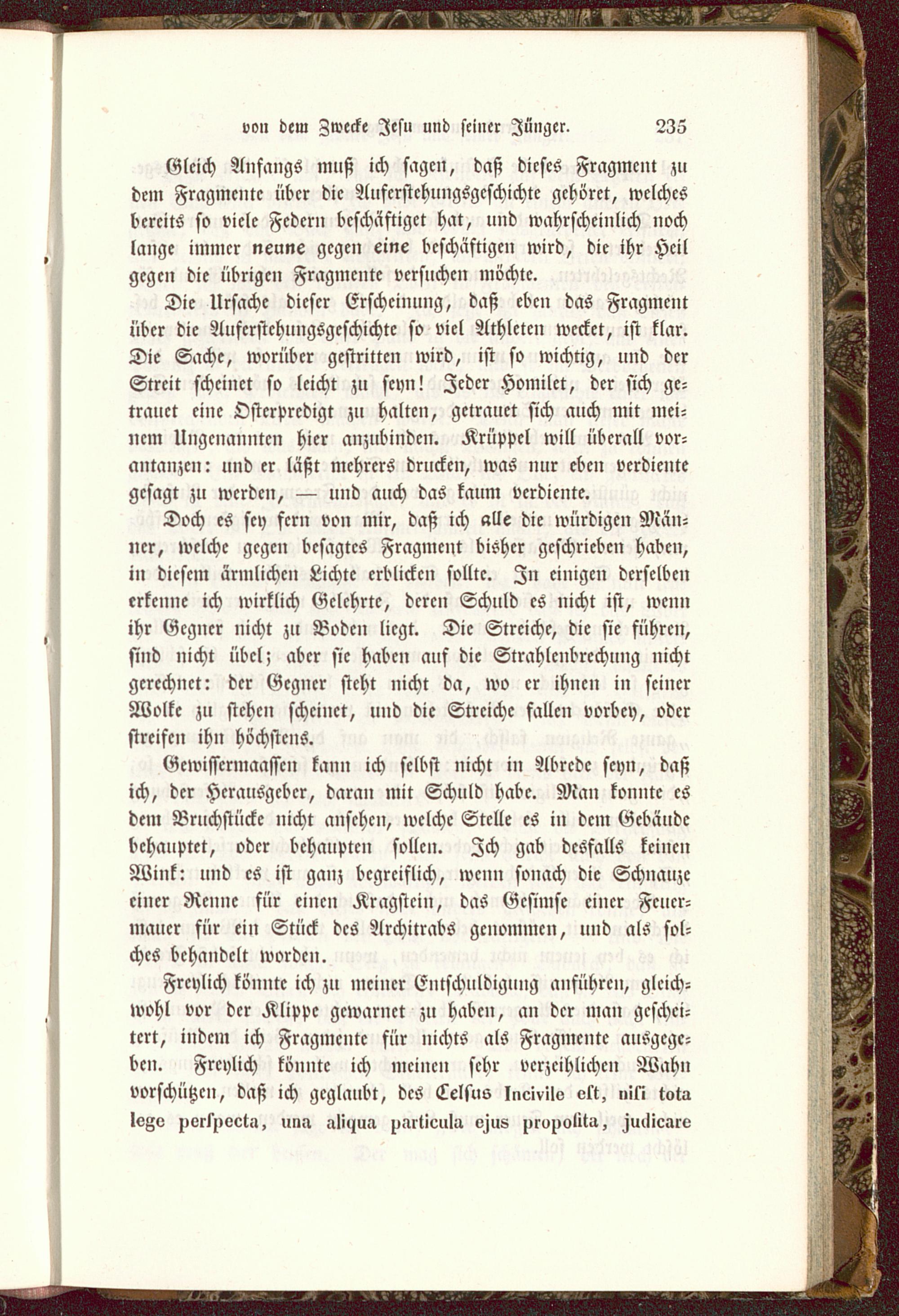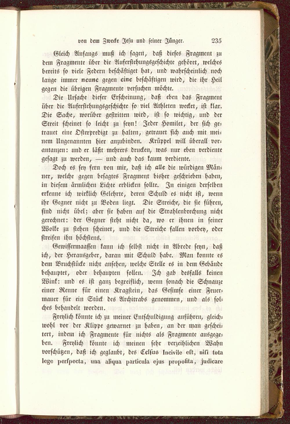 Freylich könnte ich zu meiner Entschuldigung anführen, gleich-wohl vor der Klippe gcwarnct zu haben, an der man geschei-tert, indem ich Fragmente für nichts als Fragmente ausgege-ben. Freylich könnte ich meinen sehr verzeihlichen Wahnvorschützen, daß ich geglaubt, des Celsus Incivilo ett, »iti totalege porsnoet.i, una ali^ua zimticula Hus jiroucMa, Mlicarv