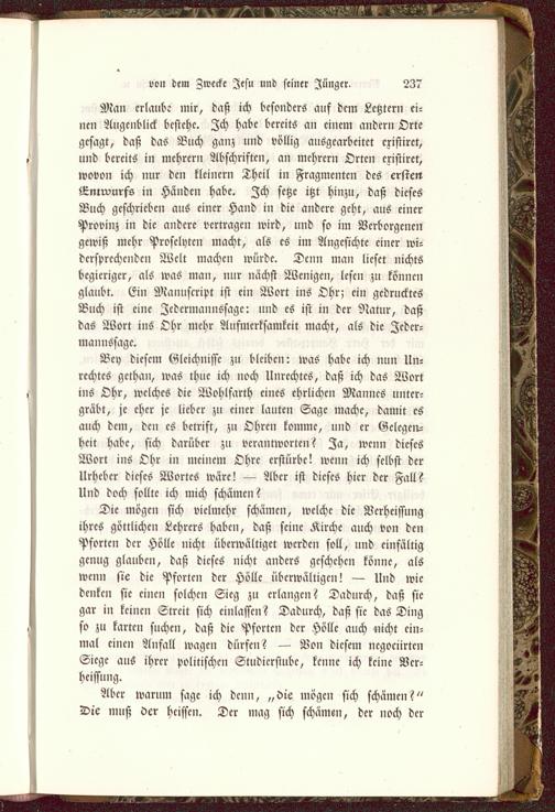 Man erlaub- mir, daß ich besonders auf dem Letzter» ei-nen Augenblick bestehe. Zch habe bereits an einem andern Ortegesagt, daß das Buch ganz und völlig ausgearbeitet cxistiret,und bereits in mchrcrn Abschriften, an mehrcrn Orten cristiret,wovon ich nur den kleinern Theil in Fragmenten des erstenEntwurfs in Händen habe. Zch setze itzt hinzu, daß diesesBuch geschrieben aus einer Hand in die andere geht, aus einerProvinz in die andere vertragen wird, und so im Verborgenengewiß mehr Prosclytcn macht, als es im Angcsichtc einer wi-dersprechenden Welt machen würde. Denn man liefet nichtsbegieriger, als was man, nur nächst Wenigen, lesen zu könnenglaubt. Ein Manuskript ist ein Wort ins Ohr; ein gedrucktesBuch ist eine Zcdcrmannssage: und es ist in der Natur, daßdas Wort ins Ohr mehr Aufmerksamkeit macht, als die Zcder-mannssagc.