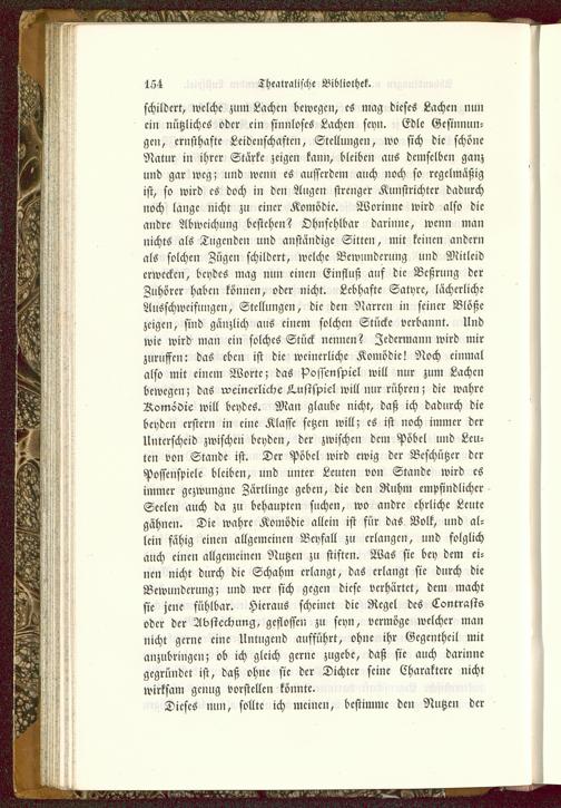 schildert, welche zum Lache» bewege», es mag dieses Lachen »u»ein nützliches oder ein sinnloses Lachen seyn. Edle Gesinnun-gen, ernsthafte Leidenschaften, Stellungen, wo sich die schöneNatur in ihrer Stärke zeigen kann, bleiben aus demselben ganzund gar weg; und wenn es ausserdem auch noch so regelmäßigist, so wird es doch in den Augen strenger Kunstrichtcr dadurchnoch lange nicht zu einer Komödie. Worinne wird also dieandre Abweichung bestehen? Ohnfchlbar darinne, wenn mannichts als Tugenden und anständige Sitten, mit keinen andernals solchen Zügen schildert, welche Bewunderung und Mitleiderwecken, beydes mag nun einen Einfluß auf die Bcßrung derZuhörer haben können, oder nicht. Lebhafte Satyre, lächerlicheAusschweifungen, Stellungen, die den Narren in seiner Blößezeigen, sind gänzlich aus einem solchen Stücke verbannt. Undwie wird man ein solches Stück nennen? Jedermann wird mirzuruffcn: das eben ist die weinerliche Komödie! Noch einmalalso mit einem Worte; das Possenspiel will nur zum Lachenbewegen; das weinerliche Lustspiel will nur rühren; die wahreRomövie will beydes. Man glaube nicht, daß ich dadurch diebeyden erster» in eine Klasse setzen will; es ist noch immer derUnterscheid zwischen beyden, der zwischen dem Pöbel und Leu-ten von Stande ist. Der Pöbel wird ewig der Beschützer derPossenspiclc bleiben, und unter Leuten von Stande wird esimmer gezwungne Zärtlinge geben, die den Ruhm empfindlicherSeelen auch da zu behaupten suchen, wo andre ehrliche Leutegähnen. Die wahre Komödie allein ist für das Volk, und al-lein fähig einen allgemeinen Beyfall zu erlangen, und folglichauch einen allgemeinen Nutzen zu stiften. Was sie bey dem ei-nen nicht durch die Schahm erlangt, das erlangt sie durch dieBewunderung; und wer sich gegen diese verhärtet, dem machtsie jene fühlbar. Hieraus scheinet die Regel des Contrastsoder der Absteckung, geflossen zu seyn, vermöge welcher mannicht gerne eine Untugend aufführt, ohne ihr Gegentheil mitanzubringen; ob ich gleich gerne zugebe, daß sie auch darinnegegründet ist, daß ohne sie der Dichter seine Charaktere nichtwirksam genug vorstellen könnte.