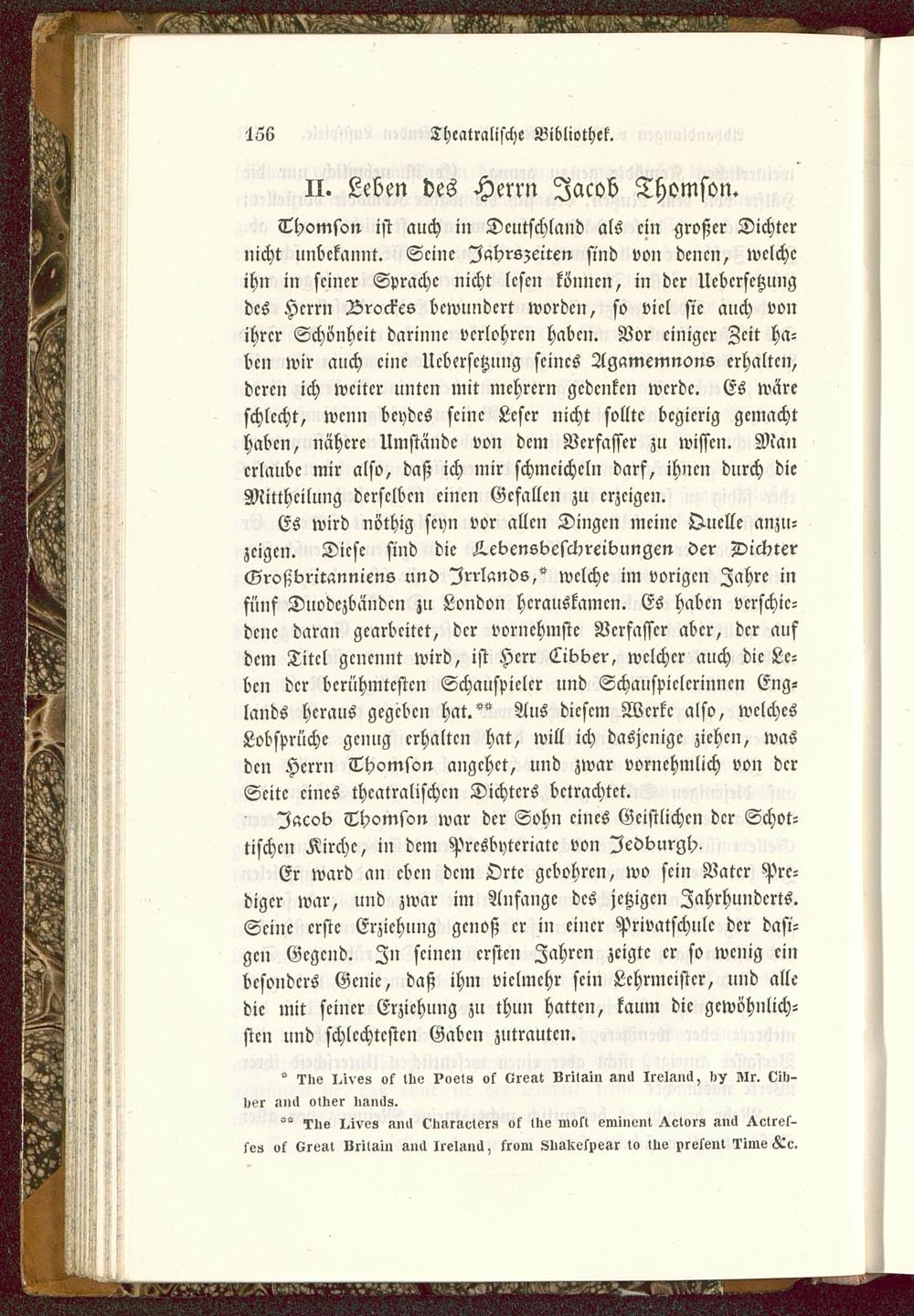 Es wird nöthig seyn vor allen Dingen meine Quelle anzu-zeigen. Diese sind die Lebensbeschreibungen der DichterGroßbritanniens und Irrlands," welche im vorigen Zahre infünf Duodezbändcn zu London herauskamen. Es haben verschie-dene daran gearbeitet, der vornehmste Verfasser aber, der aufdem Titel gcncnnr wird, ist Herr Libber, welcher auch die Le-ben der berühmtesten Schauspieler und Schauspielerinnen Eng-lands heraus gegeben hat.""' Aus diesem Werke also, welchesLobsprüche genug erhalten hat, will ich dasjenige ziehen, wasden Herrn Thomson angehet, und zwar vornehmlich von derSeite eines theatralischen Dichters betrachtet.