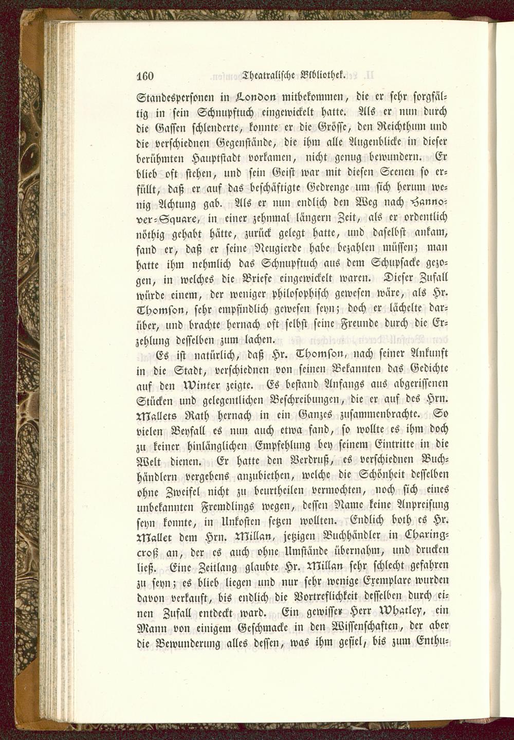 Es ist natürlich, daß Hr. Thomson, nach seiner Ankunftin die Stadt, vcrschicdncn von seinen Bekannten das Gedichteauf den Minter zeigte. Es bestand Anfangs aus abgerissenenStücken und gelegentlichen Beschreibungen, die er auf des Hrn.XNallets Rath hernach in ein Ganzes zusammenbrachte. Sovielen Beyfall es nun auch etwa fand, so wollte es ihm dochzu keiner hinlänglichen Empfehlung bey seinem Eintritt? in dieWelt dienen. Er hatte den Verdruß, es vcrschicdncn Buch-händlern vergebens anzubiethen, welche die Schönheit desselbenohne Zweifel nicht zu beurtheilen vermochten, noch sich einesunbekannten Fremdlings wegen, dessen Name keine Anpreisungseyn konnte, in Unkosten setzen wollten. Endlich both es Hr.Malltt dem Hrn. Millan, jetzigen Buchhändler in Lhanng-croß an, der es auch ohne Umstände übernahm, und druckenließ. Eine Zeitlang glaubte Hr. XNillan sehr schlecht gefahrenzu seyn; es blieb liegen und nur sehr wenige Exemplare wurdendavon verkauft, bis endlich die Vortrcflichkcit desselben durch ei-nen Zufall cntdeckt ward. Ein gewisse» Herr Wharley, einMann von einigem Geschmacke in den Wissenschaften, der aberdie Bewunderung alles dessen, was ihm gefiel, bis zum Enthu-