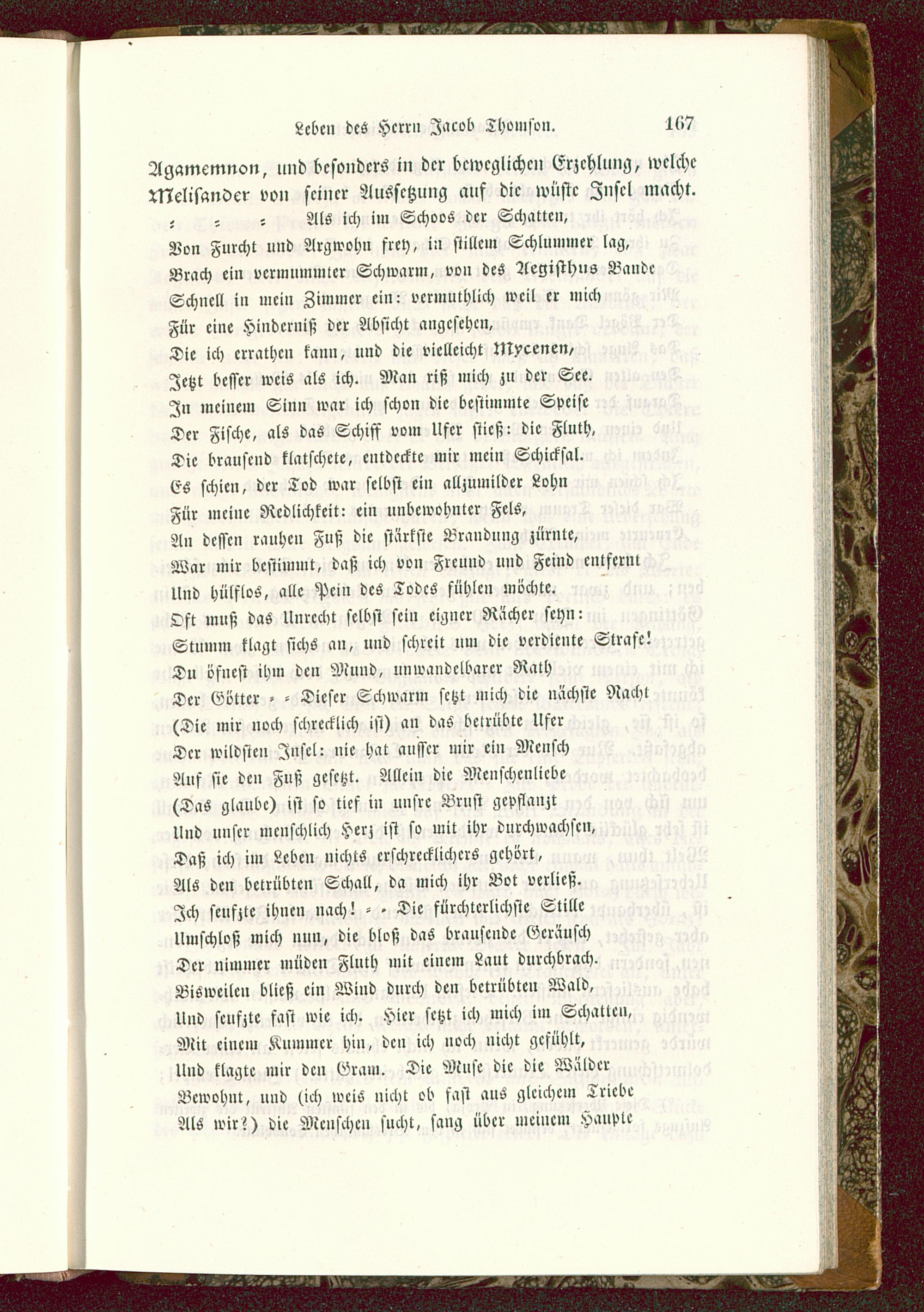 Agamemnon, und besonders in der beweglichen Erzchlung, welcheMelisandcr von seiner Aussetzung auf die wüste Znscl macht.- - - Als ich im Schoos der Schatten,Von Fnrcht und Argwohn frey, in stillem Schlummer lag,Brach ein vermummter Schwärm, von des Aegisthus BandeSchnell in mein Zimmer ein: vermuthlich weil er michFür eine Hinderniß der Absicht angesehen,Die ich errathen kann, und die vielleicht Mycene»/Jetzt besser weis als ich. Man riß mich zu der See.In meinem Sinn war ich schon die bestimmte SpeiseDer Fische, als das Schiff vom Ufer stieß: die Fluth,Die brausend klatschete, entdeckte mir mein Schicksal.Es schien, der Tod war selbst ein allzumilder LohnFür meine Redlichkeit: ein unbewohnter Fels,An dessen rauhen Fuß die stärkste Brandung zürnte,War mir bestimmt, daß ich von Freund und Feind entferntUnd Hülflos, alle Pein des Todes fühlen möchte.Oft muß das Unrecht selbst sein eigner Rächer seyn:Stumm klagt sichs an, und schreit um die verdiente Strafe!Du öfnest ihm den Muud, unwandelbarer RathDer Götter - - Dieser Schwärm setzt mich die nächste Nacht(Die mir noch schrecklich ist) an das betrübte UferDer wildsten Insel: nie hat ausser mir ein MenschAuf sie den Fuß gesetzt. Allein die Menschenliebe(Das glaube) ist so tief in unsre Brust gepflanztlind unser menschlich Herz ist so mit ihr durchwachsen,Daß ich im Leben nichts crschrccklichcrs gehört,Als den betrübten Schall, da mich ihr Bot verließ.Ich seufzte ihnen »ach! - > Die fürchterlichste StilleUmschloß mich mm, die bloß das brausende GeräuschDer nimmer müden Fluth mit einem Laut durchbrach.Bisweilen bließ ein Wind durch den betrübten Wald,Und seufzte fast wie ich. Hier setzt ich mich im Schatten,Mit einem Kummer hin, den ich »och nicht gefühlt,Uud klagte mir den Gram. Die Muse die die WälderBewohnt, und (ich weis nicht ob fast aus gleichem TriebeAls wir?) die Menschen sucht, sang über meinem Haupte