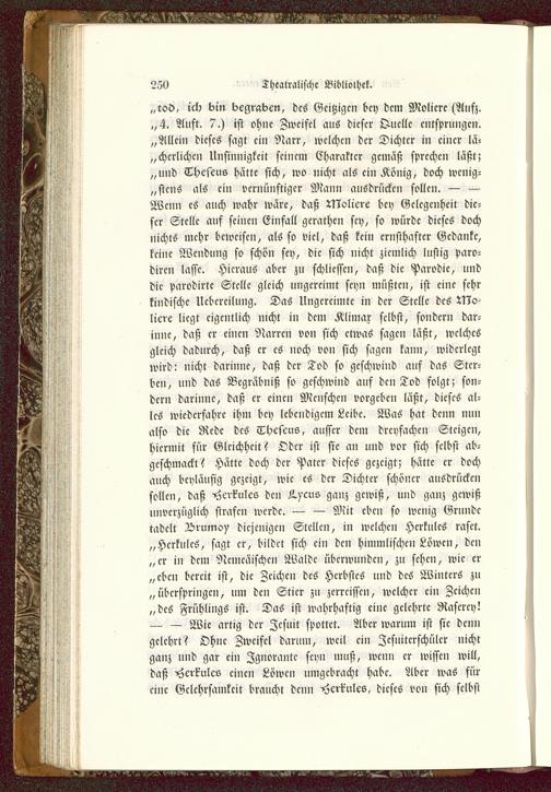 „rod, ick bin begraben, des Gcitzigcn bey dem Molicre (Aufz.,,4. Anst. 7.) ist ohne Zweifel ans dieser Quelle entsprungen.„Allein dieses sagt ein Narr, welchen der Dichter in einer lä-sterlichen Unsinnigkcit sciiicm Charakter gemäß sprechen läßt;„und Theseus hätte sich, wo nicht als ein König, doch wcnig-„stcns als ein vernünftiger Mann ausdrücken sollen. — —Wenn es auch wahr wäre, daß Moliere bey Gelegenheit die-ser Stelle auf seinen Einfall gerathen sey, so würde dieses dochnichts mehr beweisen, als so viel, daß kein ernsthafter Gedanke,keine Wendung so schön sey, die sich nicht ziemlich lustig paro-dircn lasse. Hieraus aber zu schliesset!, daß die Parodie, unddie parodirtc Stelle gleich ungereimt seyn müßten, ist eine sehrkindische Ucbcrcilung. Das Ungereimte in der Stelle des Mo-licre liegt eigentlich nicht in dem Klimax selbst, sondern dar-innc, daß er einen Narren von sich etwas sagen läßt, welchesgleich dadurch, daß er es noch von sich sagen kann, widerlegtwird: nicht darinnc, daß der Tod so geschwind auf das Ster-ben, und das Begräbnis? so geschwind auf den Tod folgt; son-dern darinnc, daß er einen Menschen vorgeben läßt, dieses al-les wicdcrfahrc ihm bey lebendigem Leibe. Was hat denn nunalso die Rede des Tbcscus, ausser dem dreyfachen Steigen,hiermit für Gleichheit? Oder ist sie an und vor sich selbst ab-geschmackt? Hätte doch der Pater dieses gezeigt; hätte er dochauch beyläufig gezeigt, wie es der Dichter schöner ausdrückensollen, daß -Herkules den K.>-cus ganz gewiß, und ganz gewißunverzüglich strafen werde. — — Mit eben so wenig Grundetadelt Drumoy diejenigen Stellen, in welchen Herkules raset.„Herkules, sagt er, bildet sich ein den himmlischen Löwen, den„er in dem Ncmcäischcn Walde überwunden, zu sehen, wie er„eben bereit ist, die Zeichen des Herbstes und des Winters zu„überspringen, um den Stier zu zcrrcisscn, welcher ein Zeichen„des Frühlings ist. Das ist wahrhaftig eine gelehrte Raserey!— — Wie artig der Jesuit spottet. Aber warum ist sie denngelehrt? Ohne Zweifel darum, weil ein Zcsuitcrschülcr nichtganz nnd gar ein Zgnorantc seyn muß, wenn er wissen will,daß -Herkules einen Löwcn umgebracht habe. Aber was süreine Gelehrsamkeit braucht denn -Herkules, dieses von sich selbst