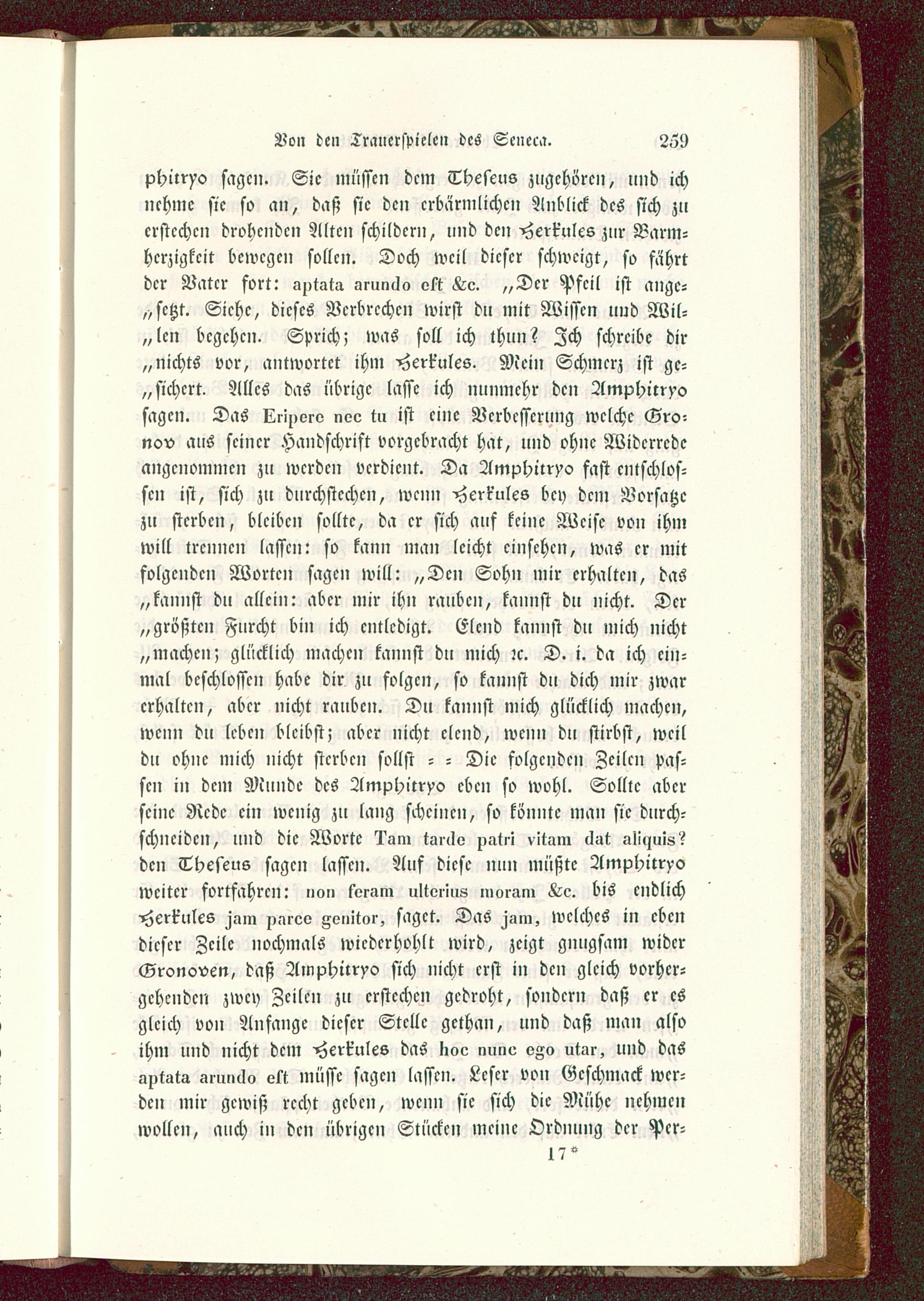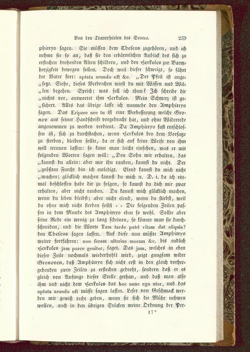 philryo sagen. Sie müssen dem Thescus zugehörcn, und ichnehme sie so an, daß sie den erbärmlichen Anblick des sich znerstechen drohenden Alten schildern, und den -Herkules zur Barm-herzigkeit bewegen sollen. Doch weil dieser schweigt, so fährtder Vater fort: »ptat-l arunclo oK Ae. „Der Pfeil ist ange-setzt. Siehe, dieses Verbrechen wirst dn mit Wissen und Wil -„lcn begehen. Sprich; was soll ich thun? Ich schreibe dir„nichts vor, antwortet ihm Herkules. Mein Schmerz ist ge-sichert. Alles das übrige lasse ich nunmehr den Amphilryosagen. Das kriporo nee tu ist eine Verbesserung welche Gro-nov aus seiner Handschrift vorgebracht hat, und ohne Widerredeangenommen zu werden verdient. Da Amphilryo fast entschlos-sen ist, sich zu durchstechen, wenn -Herkules bey dem Vorsätzezu sterben, bleiben sollte, da er sich auf keine Weise von ihmwill trennen lassen: so kann man leicht einsehen, was er mitfolgenden Worten sagen will: „Den Sohn mir erhalten, das„kannst du allein: aber mir ihn rauben, kannst du nicht. Der„größten Furcht bin ich entledigt. Elend kannst du mich nicht„machen; glücklich machen kannst du mich zc. D. i. da ich ein-mal beschlossen habe dir zu folgen, so kannst du dich mir zwarerhalten, aber nicht rauben. Du kannst mich glücklich machen,wenn du leben bleibst; aber nicht elend, wenn du stirbst, weildu ohne mich nicht sterben sollst - - Die folgenden Zeilen pas-sen in dem Munde des Amphilryo eben so wohl. Sollte aberseine Rede ein wenig zu lang scheinen, so könnte man sie durch-schneiden, und die Worte I°iim taitlv patri vitam clut »iumis?den iLheseus sagen lassen. Auf diese nun müßte Amphilryoweiter fortfahren: um, toram ultoi-ms moram Kie. bis endlich-Herkules ^jmn p.irco Fomtm-, saget. Das ^->m, welches in ebendieser Zeile nochmals wicdcrhohlt wird, zeigt gnugsam widerGronoven, daß Amphilryo sich nicht erst in den gleich vorher-gehenden zwey Zeilen zu erstechen gedroht, sondern daß er esgleich von Anfange dieser Stelle gethan, und daß man alsoihm und nicht dem -Herkules das koe nunv vgo utar, und das»prata arunclo ett müsse sagen lassen. Leser von Geschmack wer-den mir gewiß recht geben, wenn sie sich die Mühe nehmenwollen, auch in den übrigen Stücken meine Ordnung der Pcr -